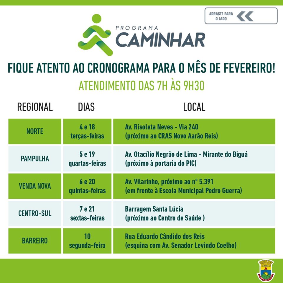 Secretaria Municipal de Esportes e Lazer desenvolve o programa Caminhar com o objetivo de estimular a prática de atividades físicas e promover a saúde. Com esta diretriz, o programa atua com ações intituladas de Caminhar nas Pistas e Caminhar na Escola. Com o Caminhar nas Pistas, os praticantes de caminhada da capital podem ter acesso periodicamente a testes de aptidão física e a orientações sobre a forma mais segura e adequada de praticar atividades físicas. O atendimento ocorre durante todo o ano, entre 7h e 9h30, de segunda a sexta-feira, em nove pistas de caminhada da cidade, uma em cada regional. Os usuários de uma mesma pista podem usufruir desse serviço a cada duas semanas.