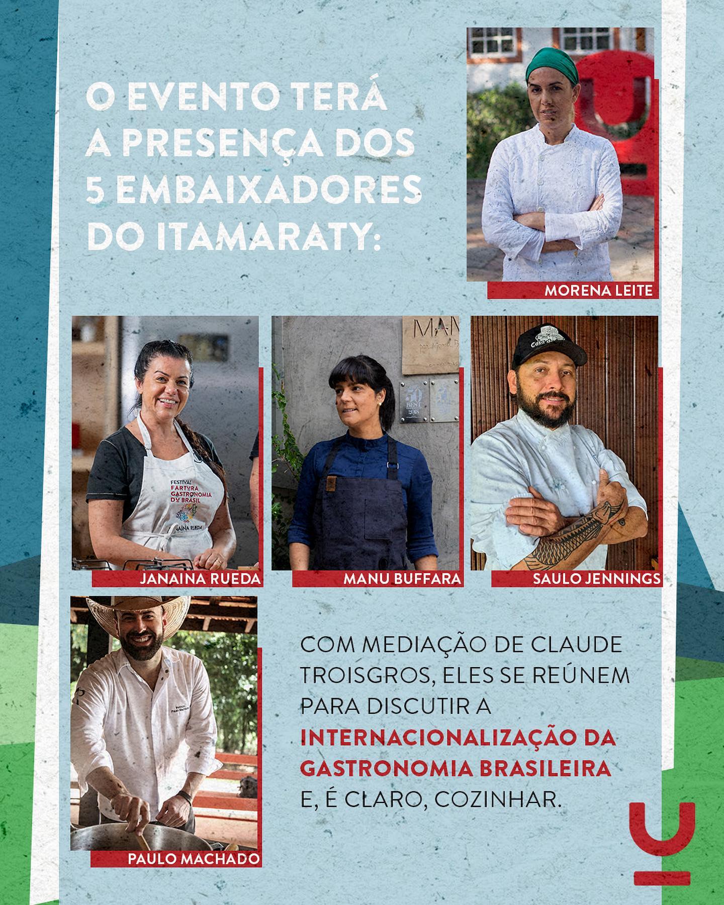 O evento terá a presença dos cinco embaixadores gastronômicos do Itamaraty, um de cada região do país: Morena Leite, Janaina Rueda, Manu Buffara, Saulo Jennings e Paulo Machado.