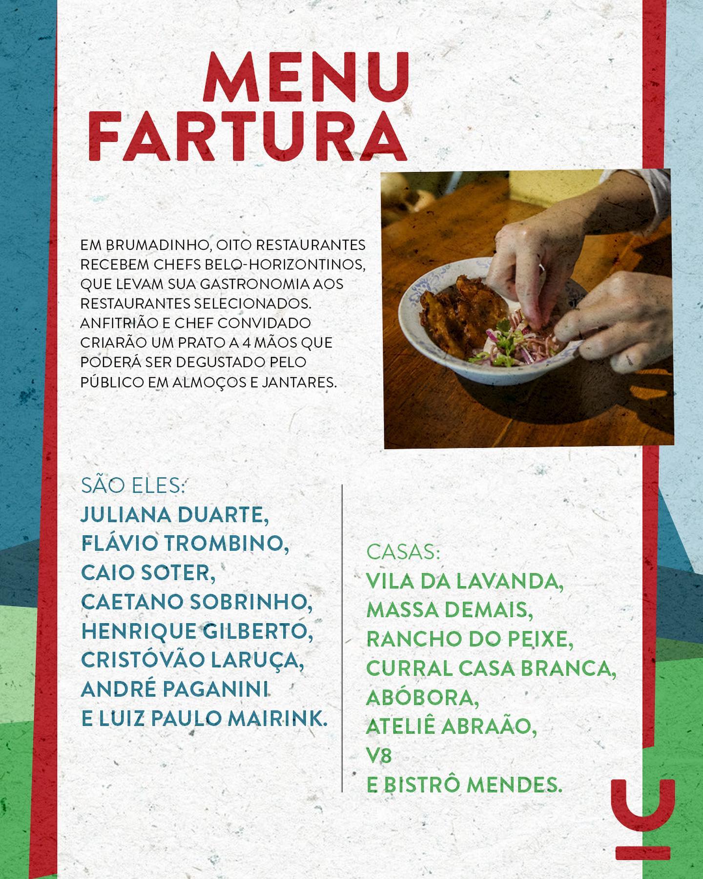 O Fartura Gastronomia conta, ainda, com a participação de chefs de Belo Horizonte e Brumadinho em cozinhas ao vivo, almoços, jantares, além de mercearia de produtores e apresentações artísticas.