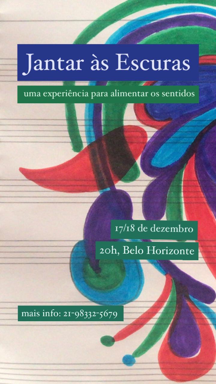 O ano está acabando. E que ano! Para simbolizar esta data, haverá um Jantar às Escuras ao ar livre em um lugar especial. Entre em contato com a gente para saber o endereço. Serão apenas 6 lugares disponíveis por vez, onde respeitaremos todos os protocolos de segurança alimentar e higiene.