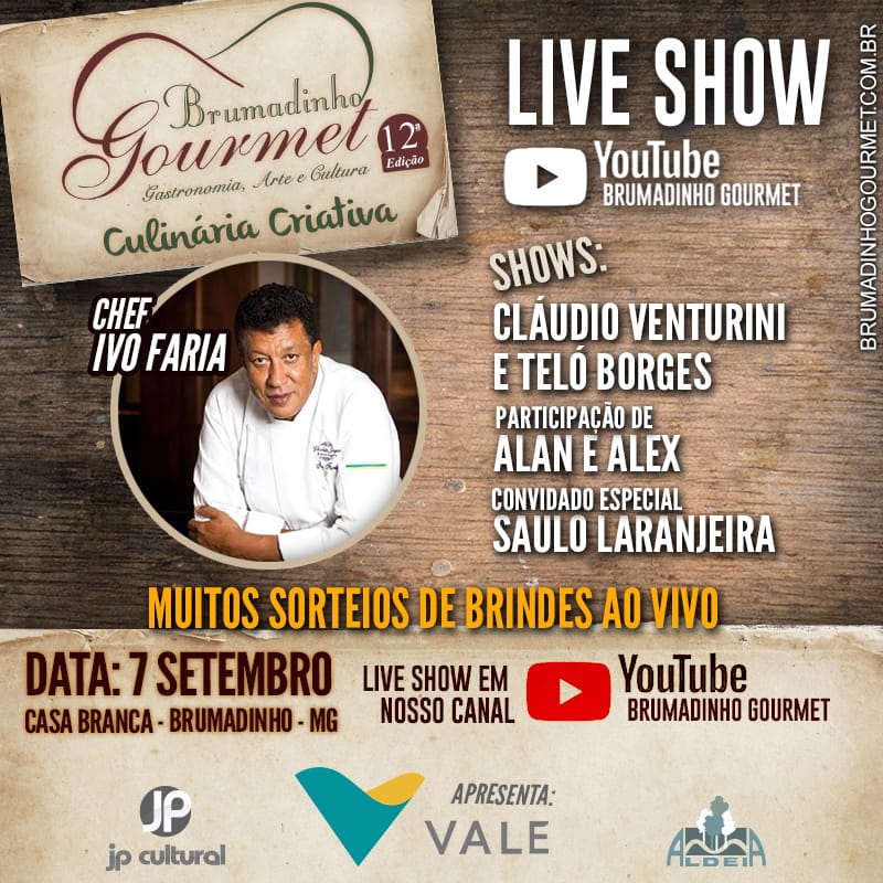 O Brumadinho Gourmet realiza nesta segunda-feira, feriado de 7 de setembro, a partir das 13h, a primeira Live-show Gastronômica do país. O prestigiado chef Ivo Faria ensinará o público a fazer pratos práticos e requintados. Ao longo do atividade, o público contará com apresentações artísticas de Claudio Venturini, Telo Borges, Alan & Alex e Saulo Laranjeira. Já a sobremesa ficará por conta da DuliCake.