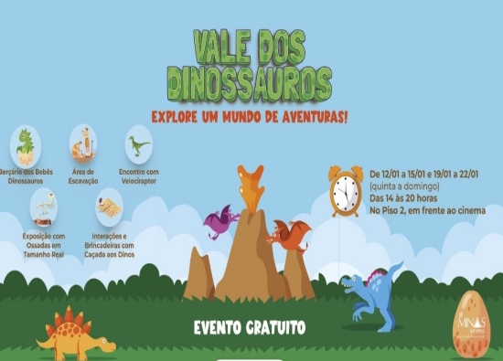 No clima de férias, o Minas Shopping promove uma viagem à era jurássica. De 12 a 15 e de 19 a 22 de janeiro (quinta-feira a domingo), o parque "Vale dos Dinossauros" promete levar diversão e abrir espaço para a garotada aprender sobre o tema.