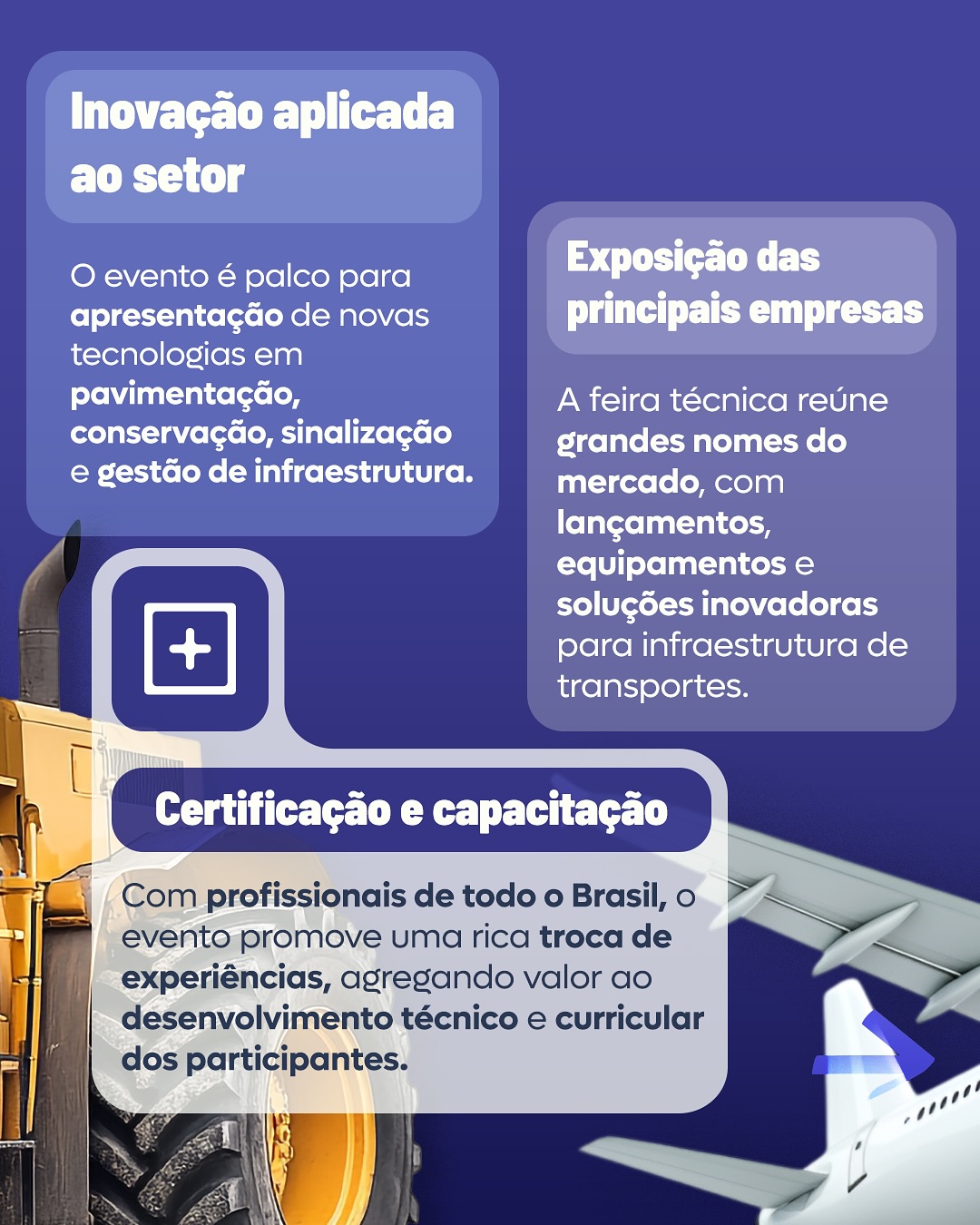Os eventos proporcionarão aos participantes intercâmbios, por meio de minicursos, palestras e apresentações de trabalhos técnicos. Serão quatro dias de oportunidades para troca de experiências e contatos com profissionais especializados no seu ramo de atuação; intercâmbio com presidentes, diretores e importantes executivos de instituições governamentais e empresas do setor; possibilidades para a discussão de estratégias, ações e perspectivas na infraestrutura dos modais de transporte.