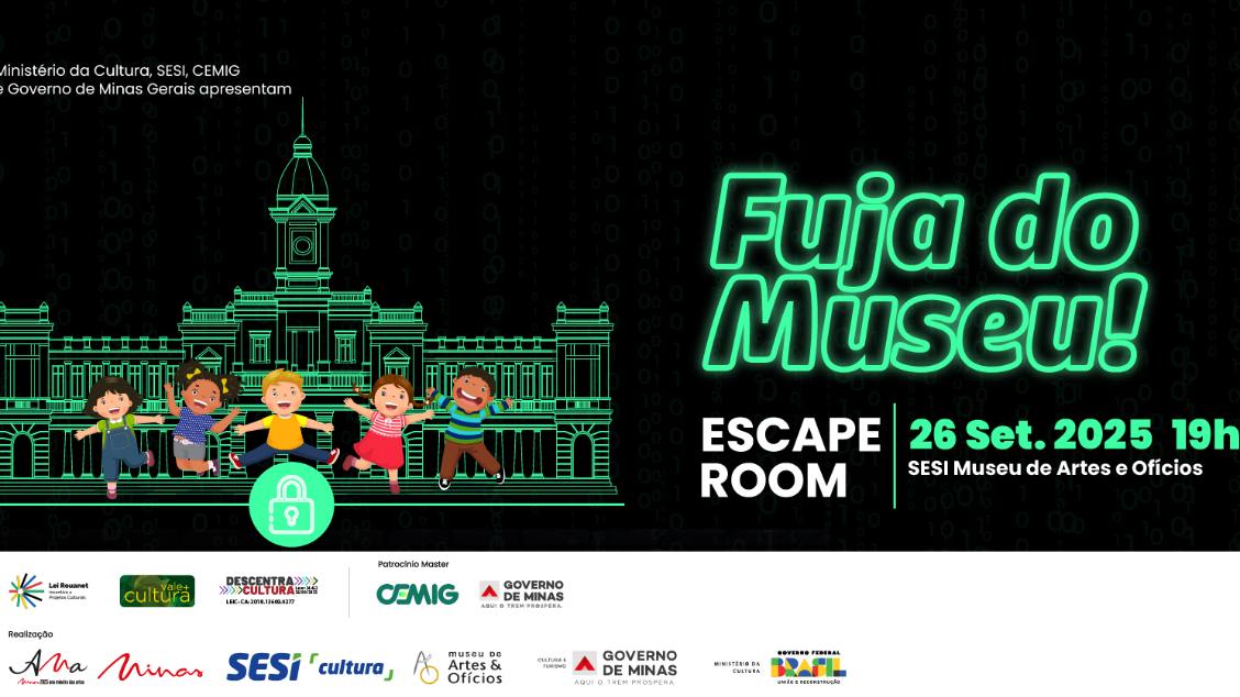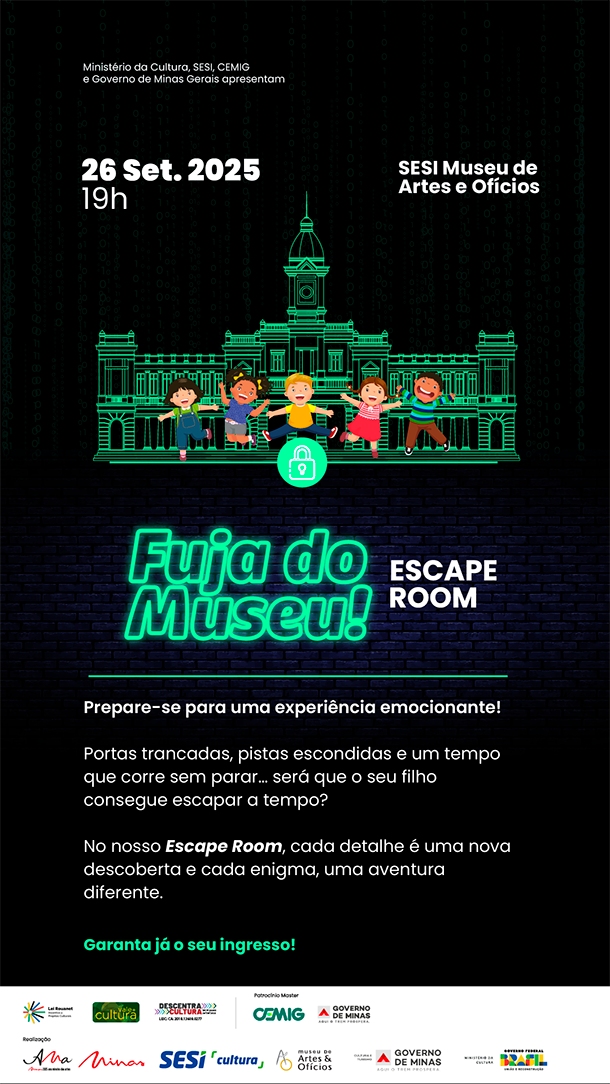 Portas trancadas, pistas escondidas e um tempo que corre sem parar... será que seu filho consegue escapar a tempo do SESI Museu de Artes e Ofícios? No Escape Room cada detalhe é uma nova descoberta e cada enigma, uma aventura diferente.