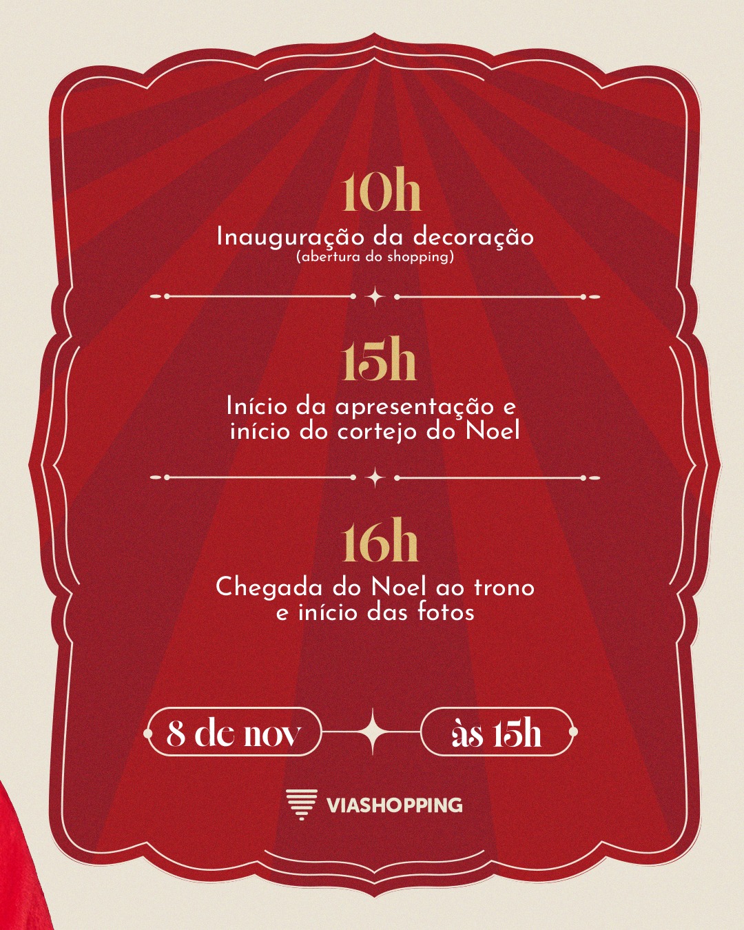 10h: Inauguração da decoração de Natal. Desde a abertura, o público já poderá apreciar os cenários iluminados e os detalhes que tornam o Via ainda mais encantador