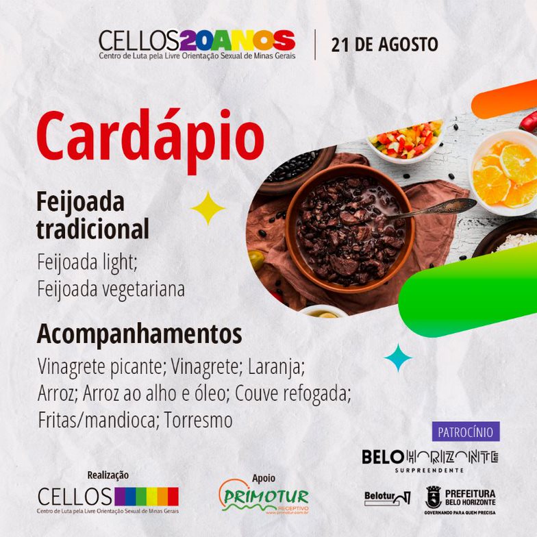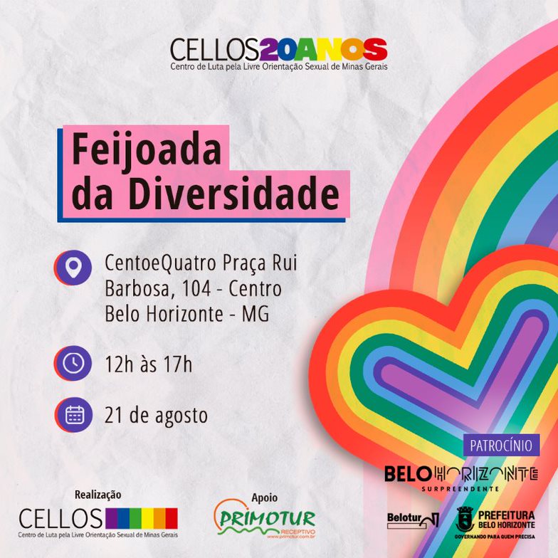 Nossa Feijoada da Diversidade neste ano será ainda mais especial, pois o Centro de Luta Pela Livre Orientação Sexual - CELLOS MG, completou 20 anos de existência.