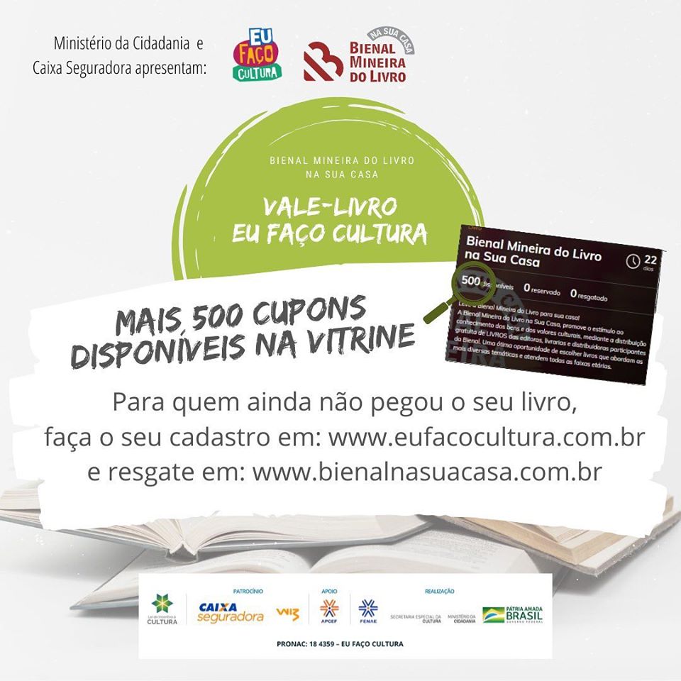 A 2ª edição aconteceu entre os dias 22 e 31 de maio e trouxe um grande presente: a possibilidade de você resgatar um livro e recebê-lo em casa, GRATUITAMENTE. A Bienal Mineira do Livro conquistou o importante apoio do Programa Eu Faço Cultura e realizará vários ciclos do Programa Vale-livro Eu Faço Cultura. Nele você (veja os perfis autorizados) poderá resgatar um cupom que dará direito a um livro, sem qualquer custo, recebendo-o na sua casa.