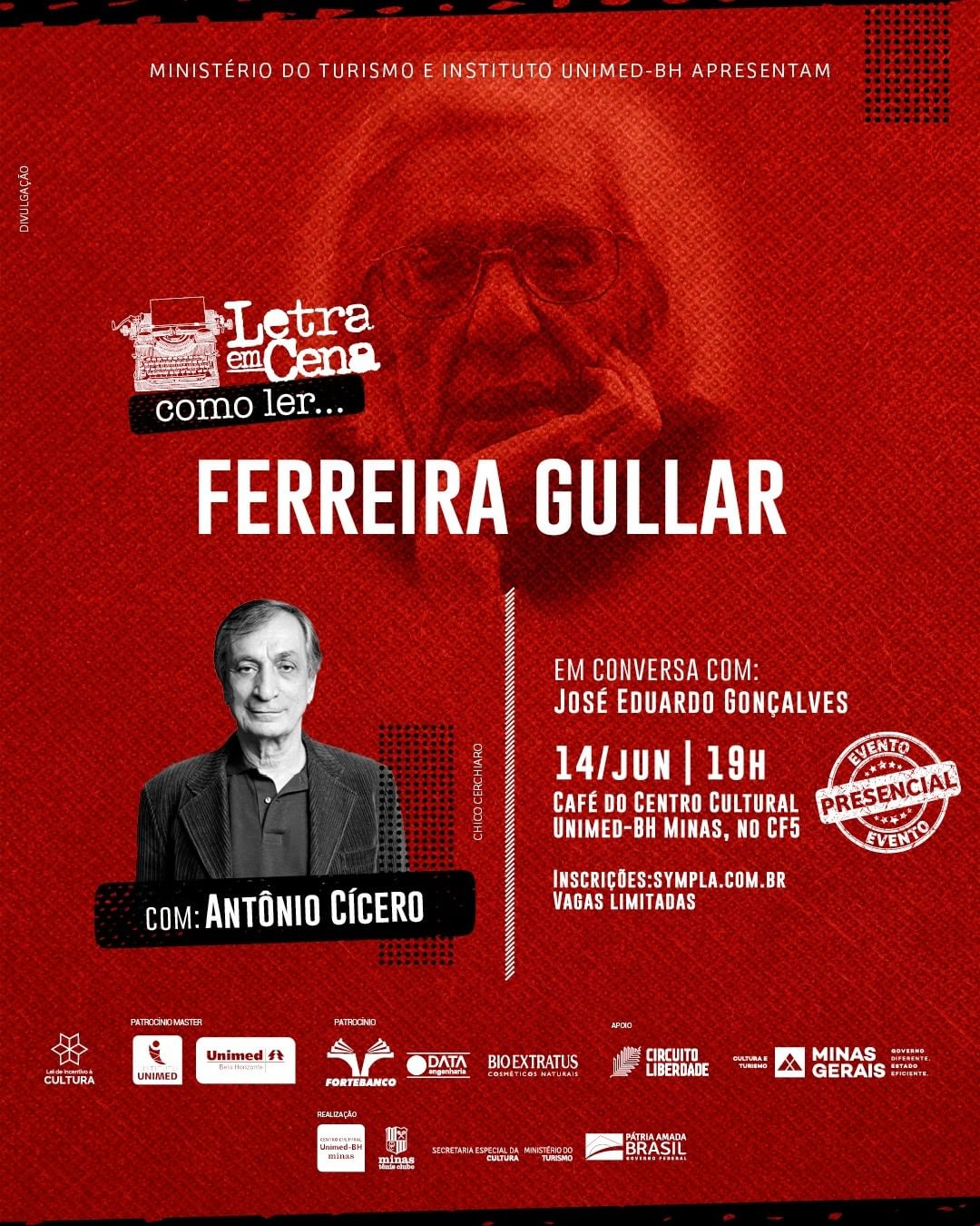 No dia 14 de junho, terça-feira, às 19h, no Café do espaço público cultural do Minas Tênis Clube, o escritor, compositor e imortal da Academia Brasileira de Letras (ABL), Antônio Cícero, vai proferir uma palestra sobre a obra de Ferreira Gullar (1930- 2016) mediada pelo curador do programa literário, o jornalista José Eduardo Gonçalves.