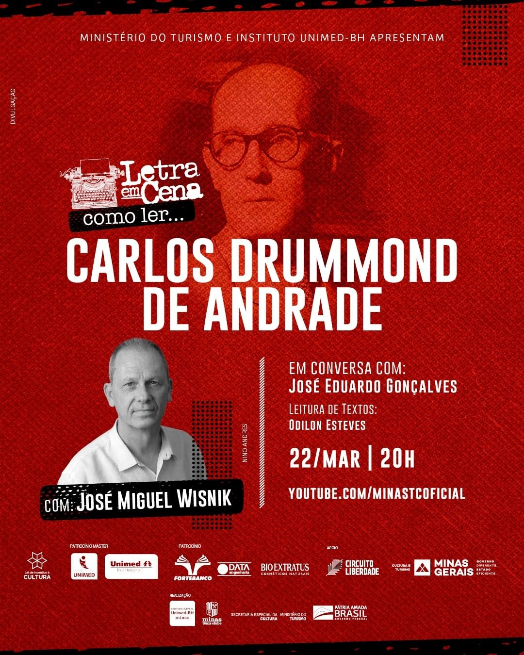 A primeira sessão da edição 2022 do programa literário do Centro Cultural Unimed-BH Minas, “Letra em cena. Como ler...”, será com o ensaísta, professor, escritor e músico José Miguel Wisnik, sobre a obra do poeta maior, Carlos Drummond de Andrade.