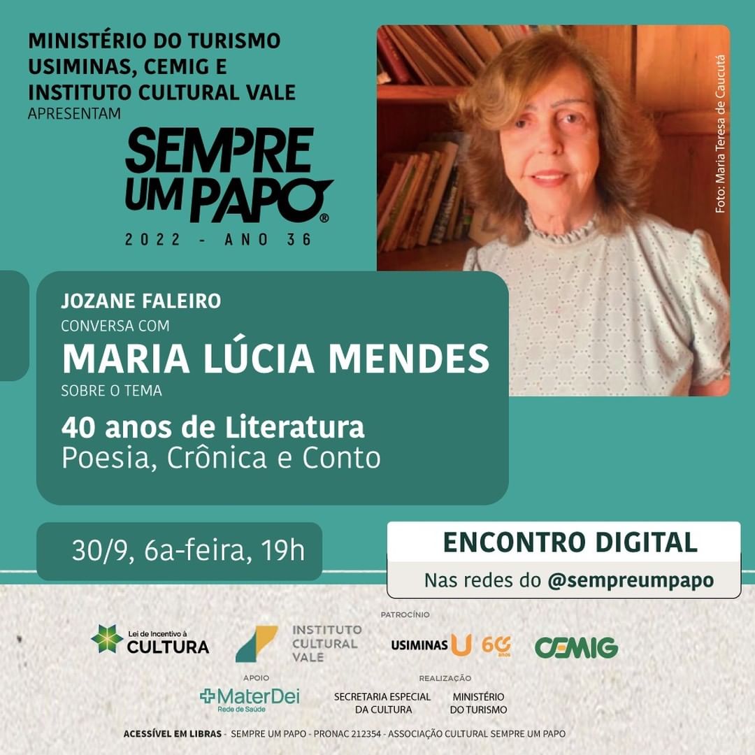 O Sempre Um Papo recebe a professora e escritora Maria Lúcia Mendes, natural de Itáuna, para falar sobre o tema ”40 anos de Literatura – Poesia, Crônica e Conto”.