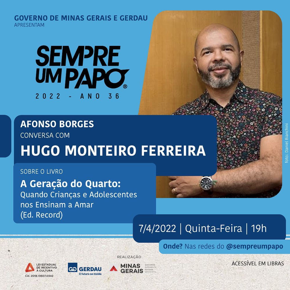 No dia 7 de abril, quinta-feira, Dia Nacional do Combate ao Bullying e à Violência na Escola, o escritor e professor Hugo Monteiro Ferreira participa do Sempre Um Papo para lançar “A Geração do Quarto: Quando Crianças e Adolescentes nos Ensinam a Amar” (Editora Record).