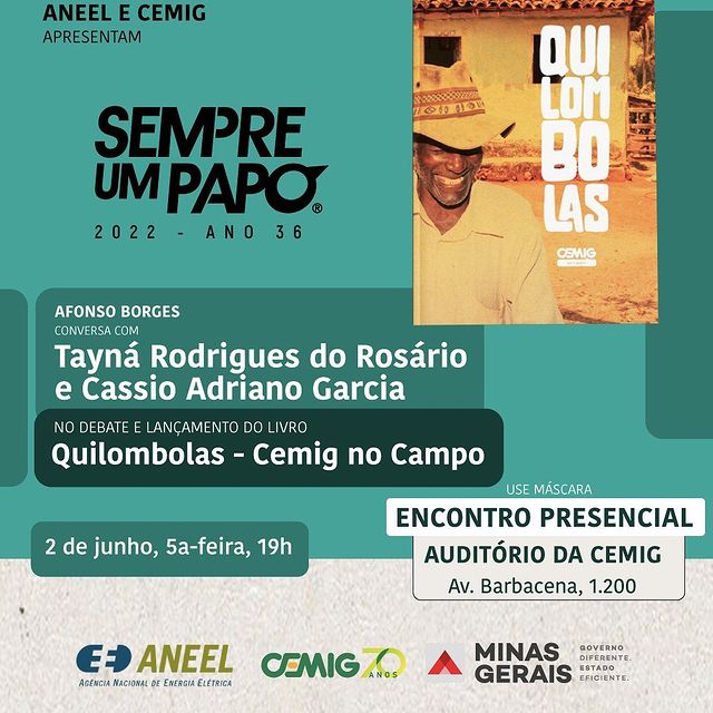 O Sempre Um Papo recebe Tayná Rodrigues do Rosário e Cássio Adriano Garcia para o debate e o lançamento do livro “Quilombolas – Cemig no Campo”, a se realizar no dia 2 de junho, quinta-feira, no auditório da Cemig, em Belo Horizonte, com entrada gratuita.