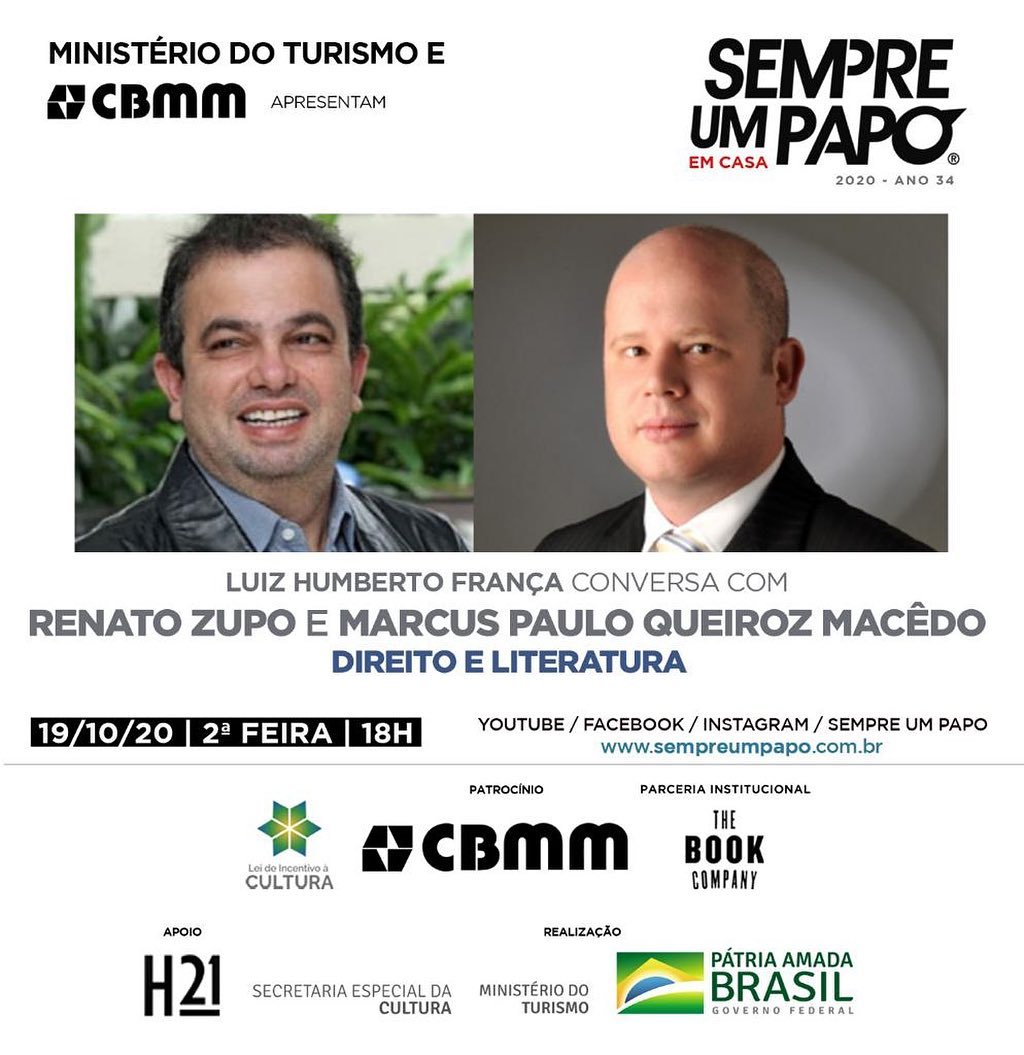 O Sempre Um Papo e a CBMM recebem o promotor e escritor Marcus Paulo Queiroz Macêdo e o juiz e escritor Renato Zupo para o debate sobre o tema “Direito e Literatura”.