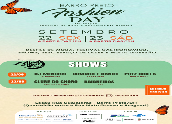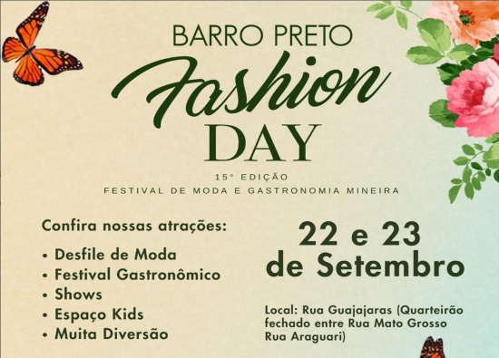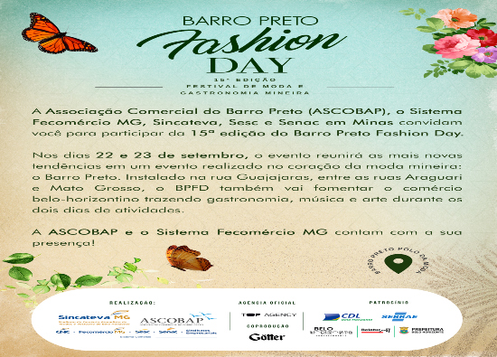 A 15a edição do Barro Preto Fashion Day será realizada nos dias 22 e 23 de setembro, na rua Guajajaras entre ruas Mato Grosso e Araguari, com o objetivo de valorizar a pluralidade da moda produzida e comercializada na região do Barro Preto, considerado o polo da moda mineira.
