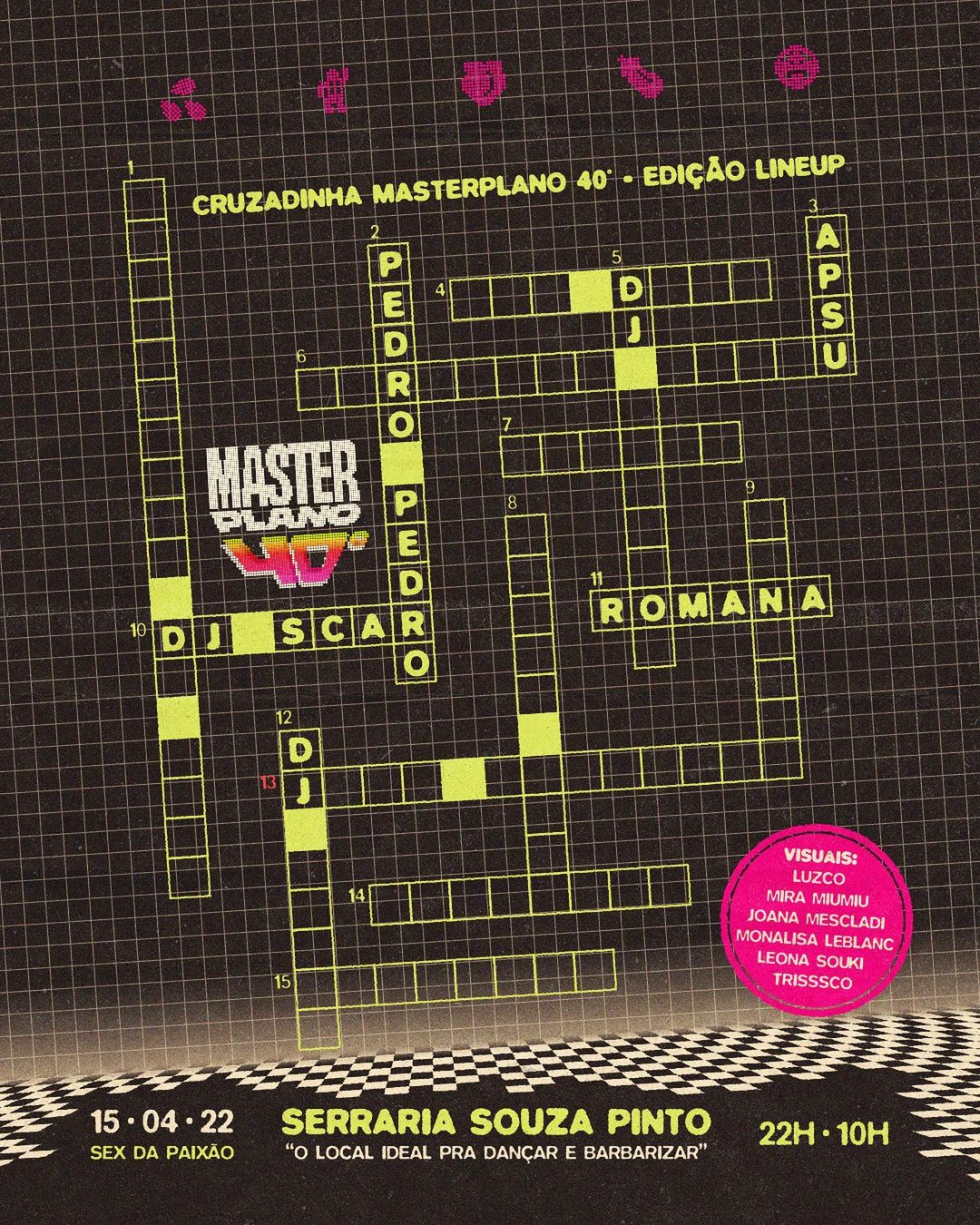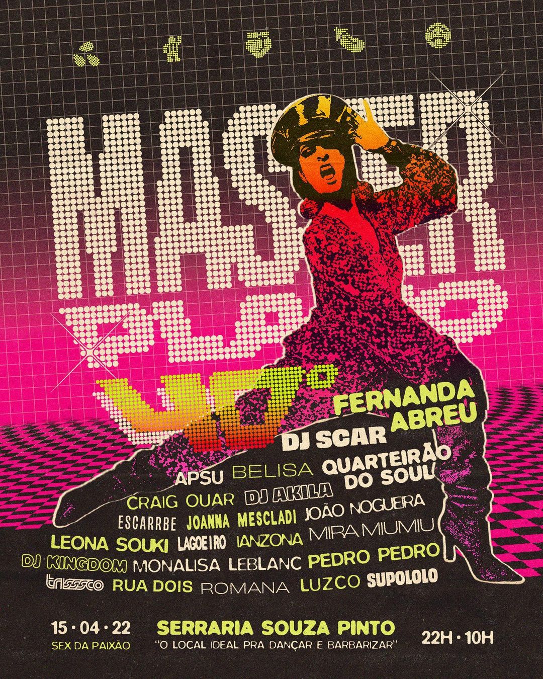No dia 15 de abril, em plena sexta-feira da paixão, o grupo belo-horizontino reúne na Serraria Souza Pinto ícones do estilo, como a madrinha do funk carioca Fernanda Abreu – que comemora 30 anos de carreira com show inédito na cidade – o Quarteirão do Soul, movimento de resistência que ocupa as ruas de BH desde 2004 e o DJ Scar, mineiro, referência da cena atual que conta com mais de 1 milhão ouvintes mensais no Spotify. Junto a eles, os nomes que trazem o de mais fresco e provocativo na música eletrônica de Belo Horizonte.