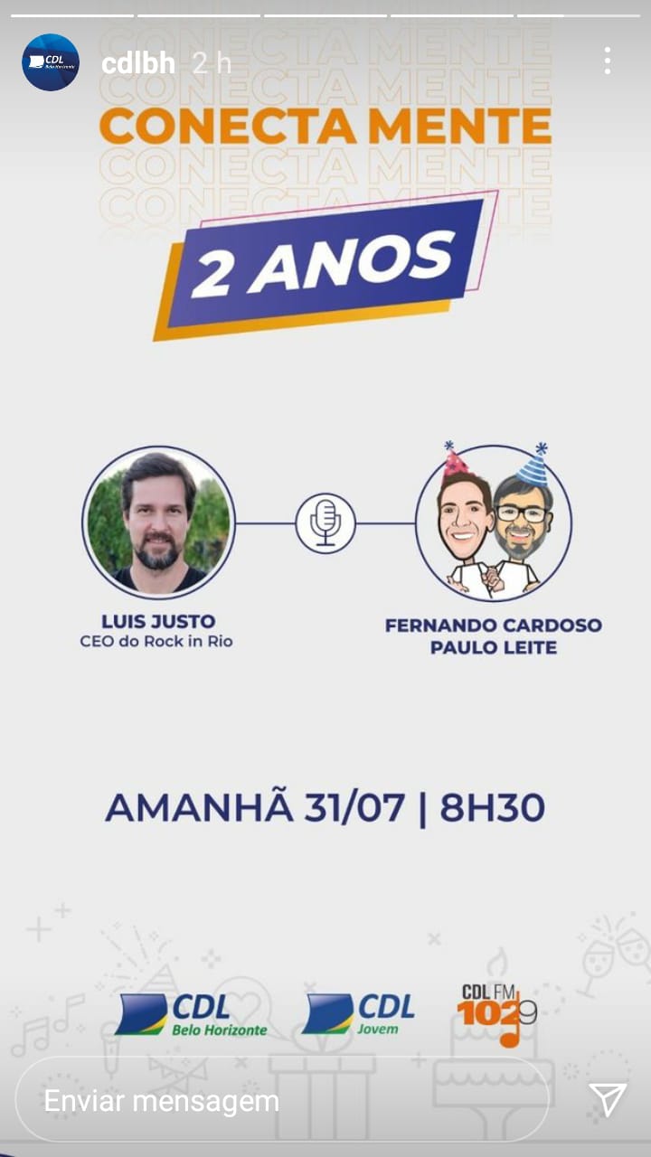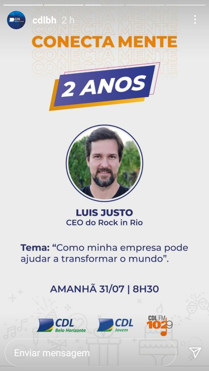 Encerrando o mês em comemoração aos dois anos de programa, amanhã, 31 de julho, no Conecta Mente, Fernando Cardoso e Paulo Leite conversam com o CEO do Rock in Rio, Luis Justo, para falar sobre “Como minha empresa pode ajudar a transformar o mundo”.