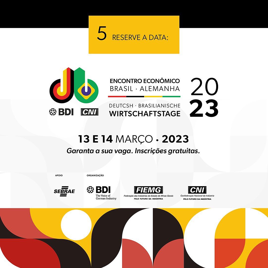 O encontro será realizado pela Confederação Nacional da Indústria (CNI), pela Federação das Indústrias Alemãs (BDI) e pela Federação das Indústrias do Estado de Minas Gerais (FIEMG), com apoio do Serviço de Apoio às Micro e Pequenas Empresas de Minas Gerais (Sebrae), nos dias 13 e 14 de março de 2023, no MinasCentro.