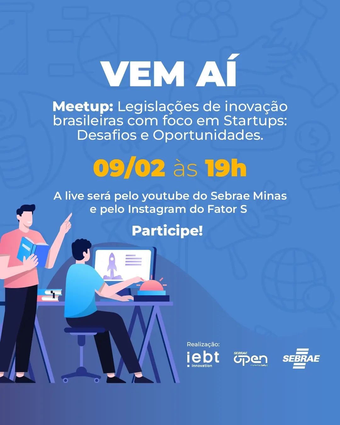 Participe do meetup: Legislações de inovação brasileiras com foco em Startups: Desafios e Oportunidades.A live será transmitida no YouTube do Sebrae Minas e no instagram @fators.sebrae.