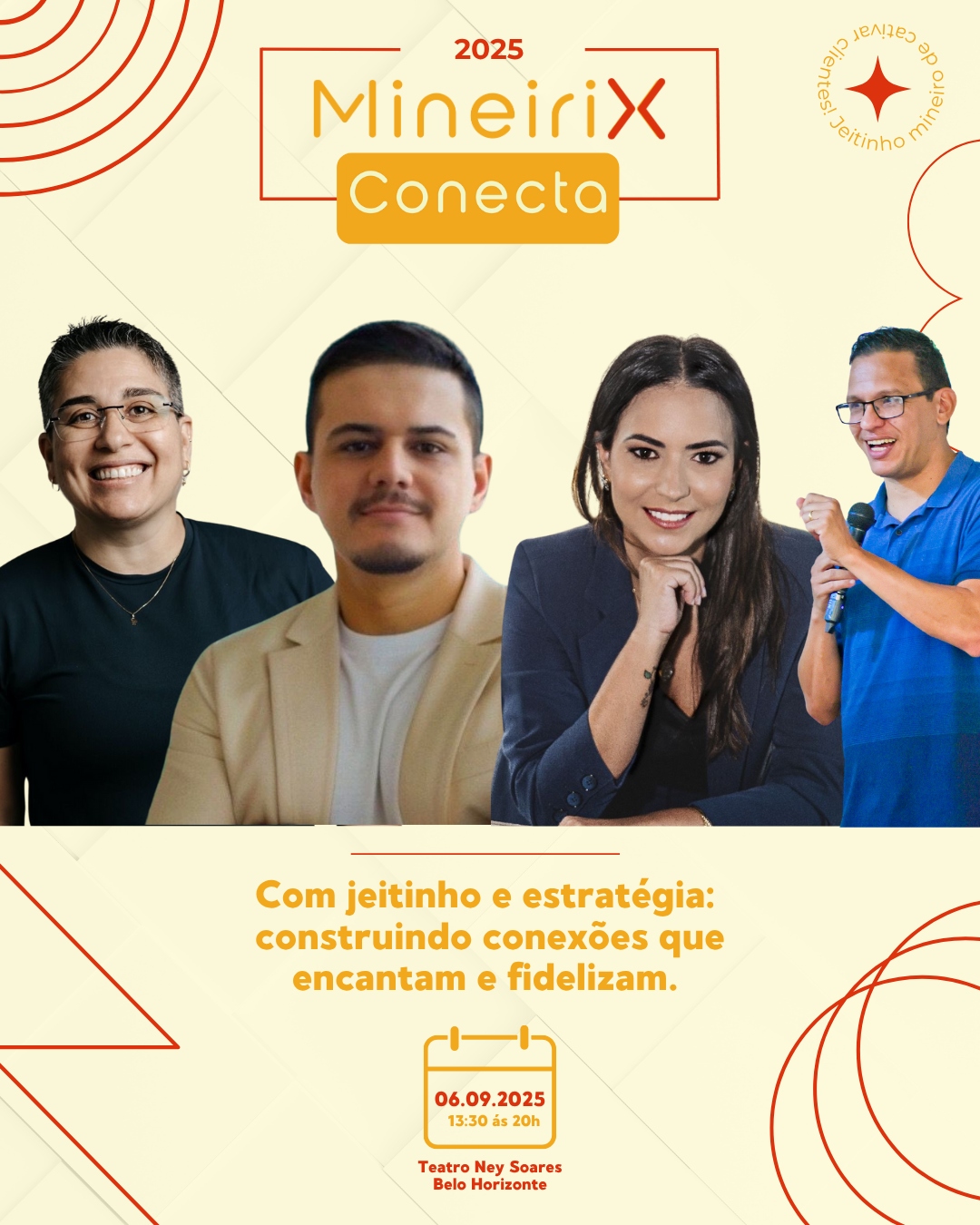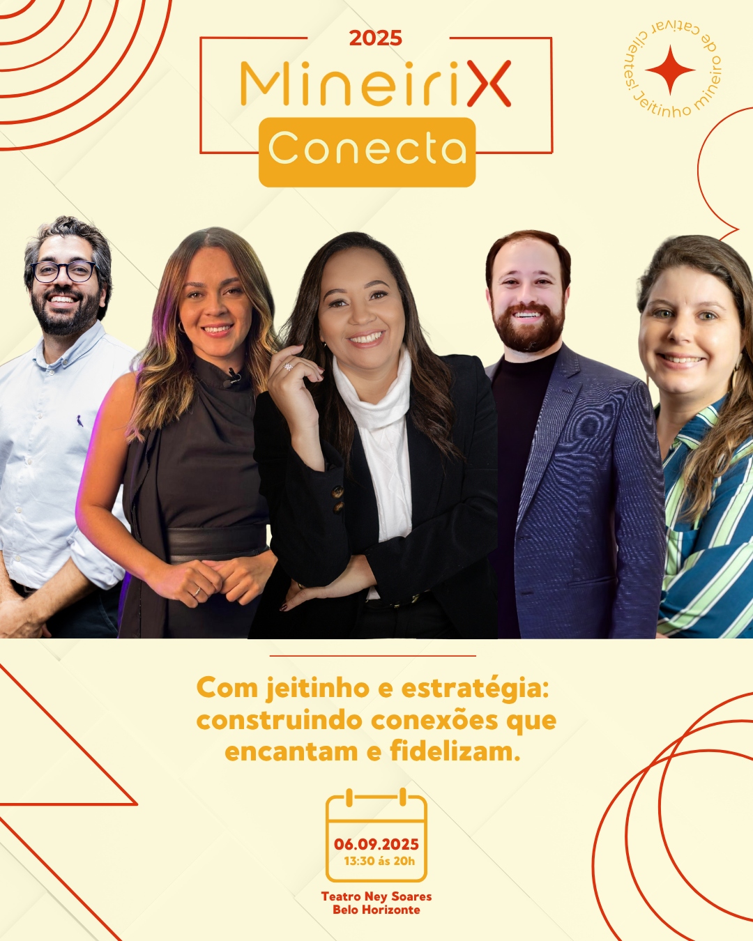 Dois eventos, um propósito: desenvolver os profissionais e fortalecer conexões para encantar clientes de forma autêntica e estratégica. No coração de Minas, a MineiriX promove um dia inteiro dedicado à troca de experiências, desenvolvimento de profissionais e fortalecimento da cultura centrada no cliente.