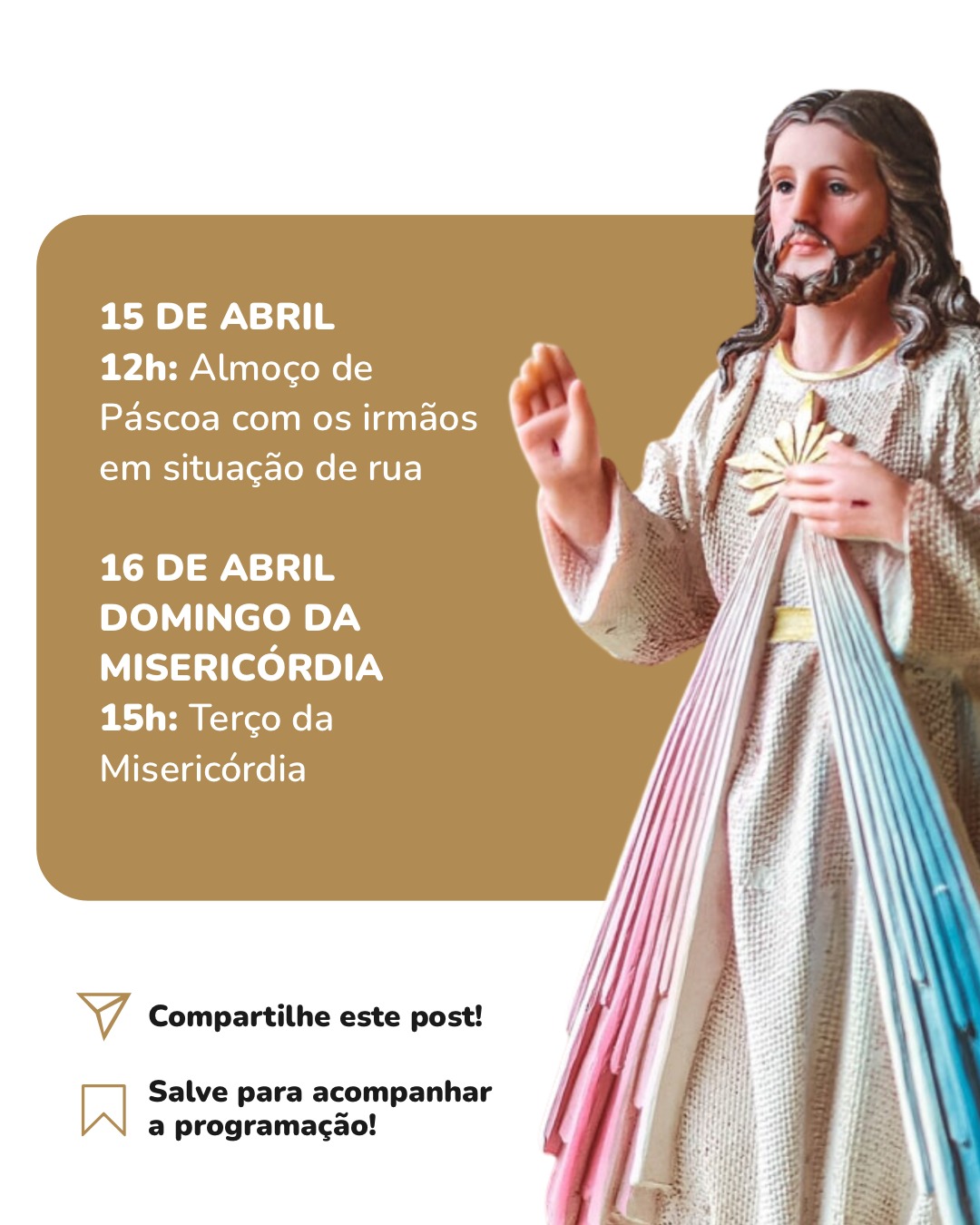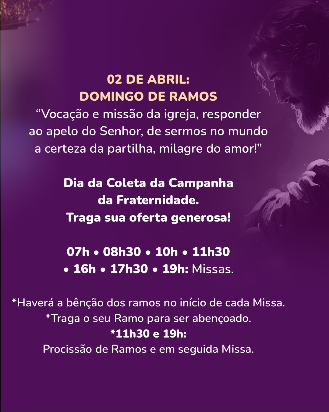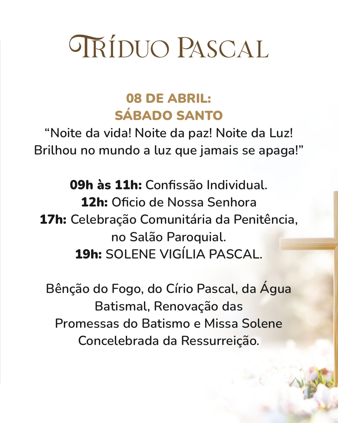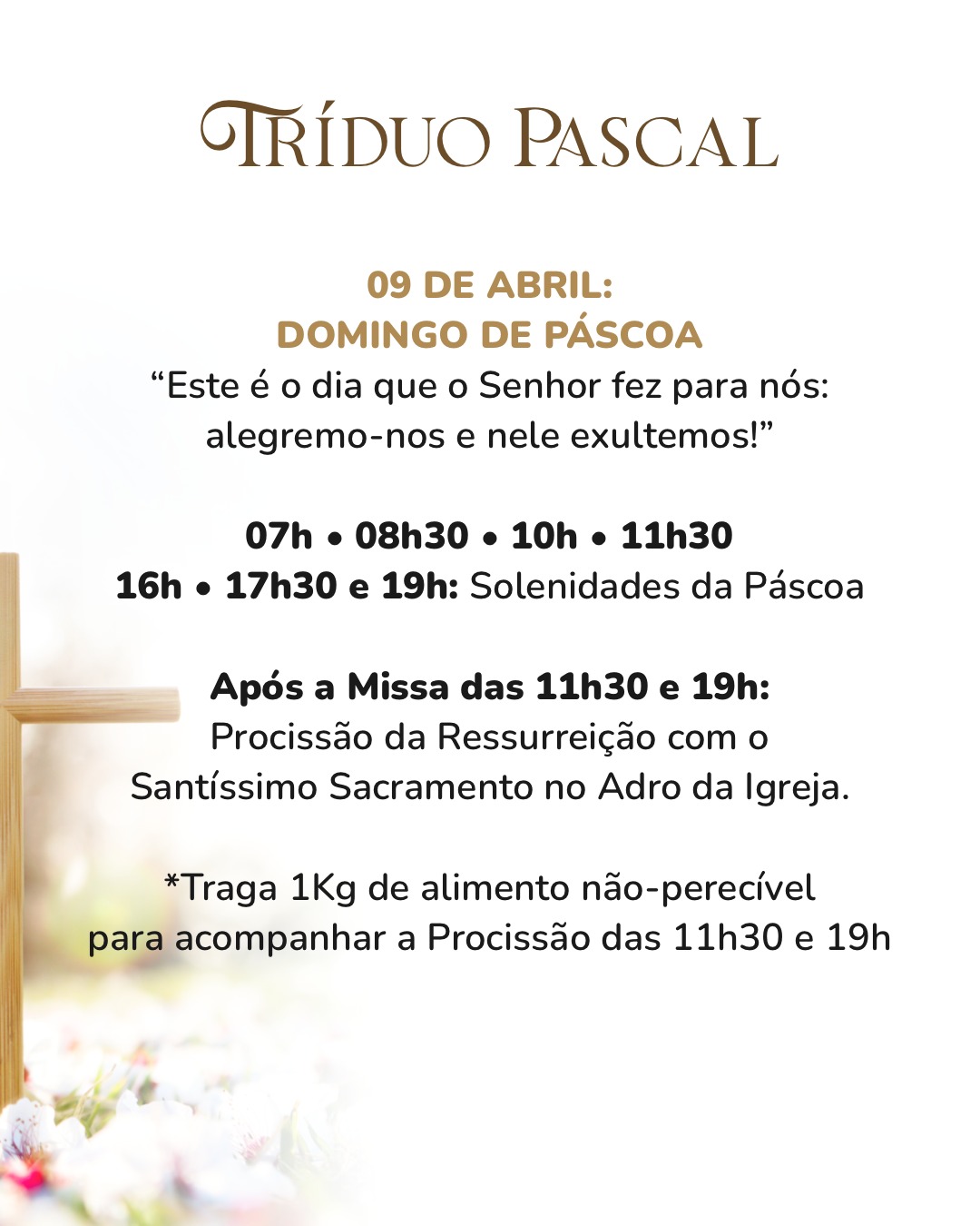 Solenidades de Páscoa: 7h, 8h30, 10h, 11h30, 16h, 17h30 e 19h