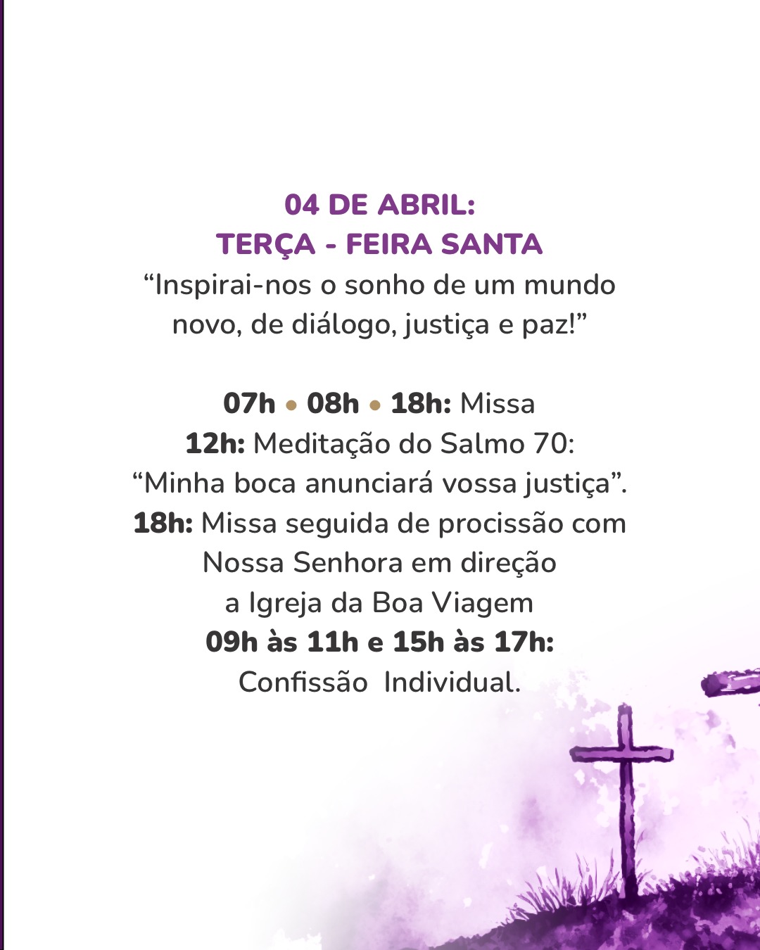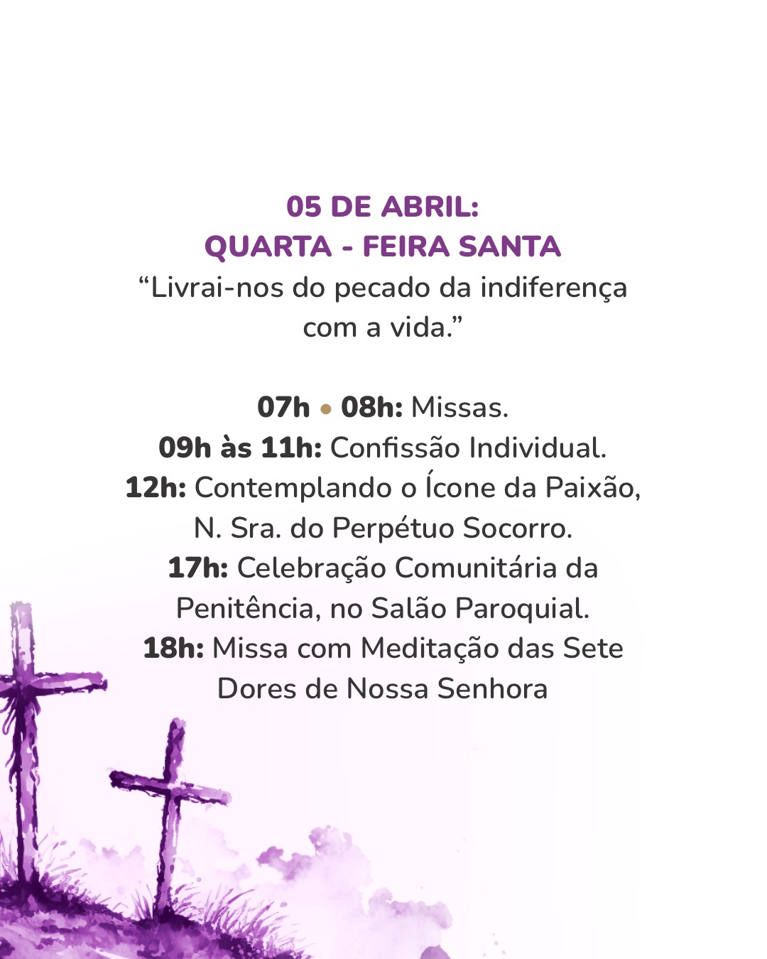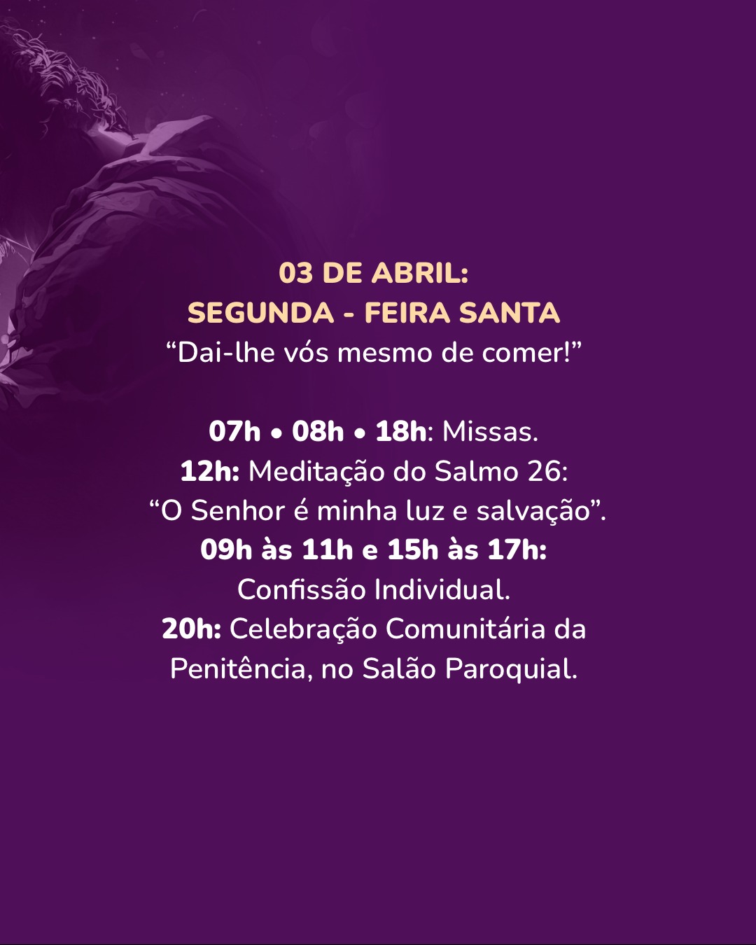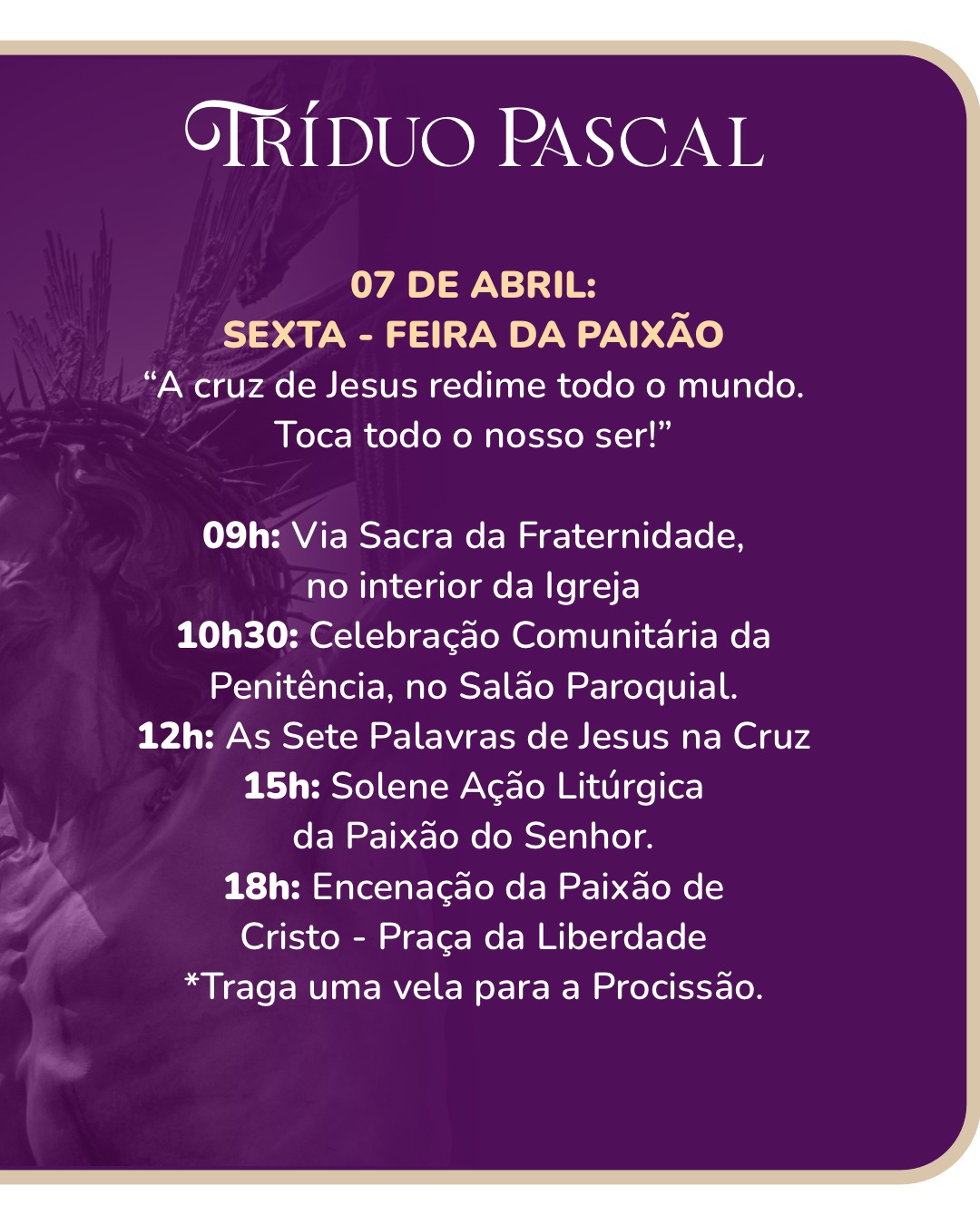 Solenidades de Páscoa: 7h, 8h30, 10h, 11h30, 16h, 17h30 e 19h