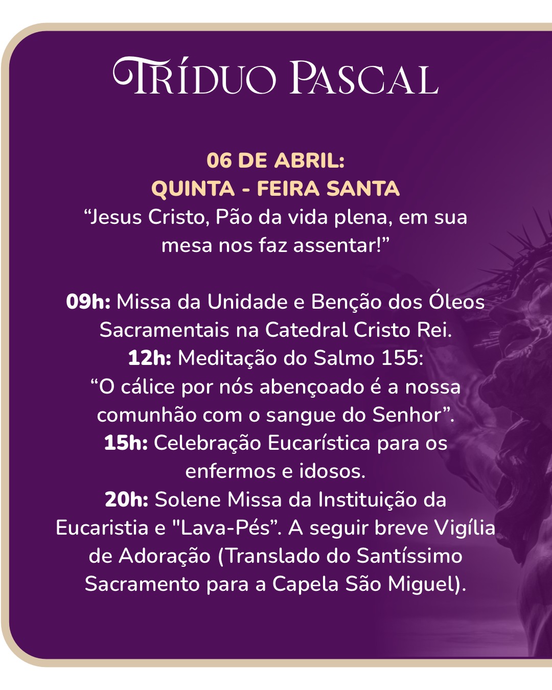 Solene Missa da Instituição da Eucaristia e "Lava Pés". A seguir breve Vigília de Adoração: 20h
