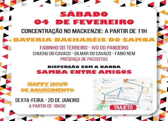 Mas antes do desfile oficial, o bloco faz um happy hour de aquecimento, com vendas de abadás nesta sexta (20/1), às 18h30, no Mackenzie Esporte Clube.