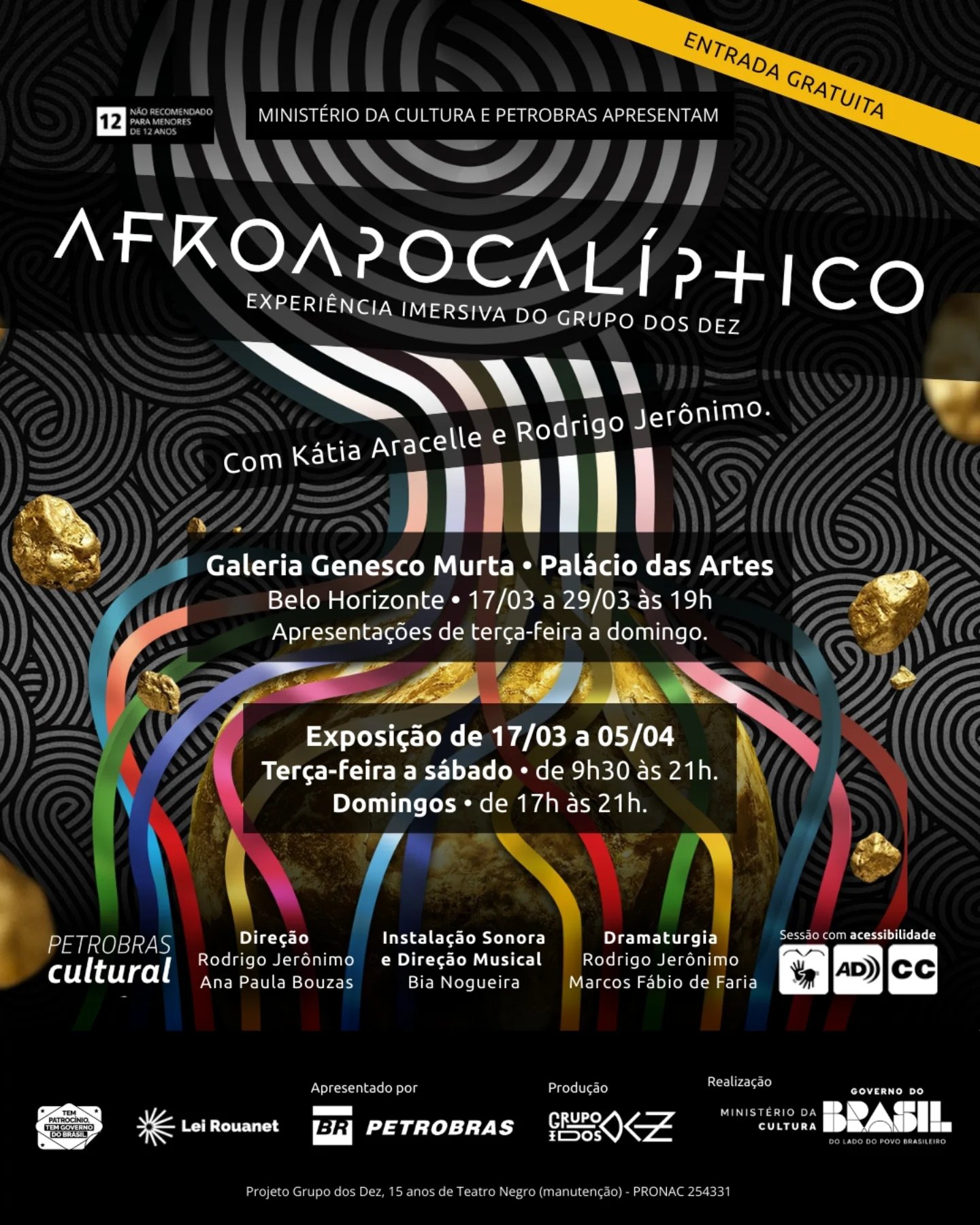 No dia 17 de março, terça-feira, às 19h, estreia “Afroapocalíptico”. Novo trabalho do Grupo dos Dez (Madame Satã), propõe ao espectador uma experiência artística imersiva e sensorial que leva o teatro para dentro da Galeria Genesco Murta, no Palácio das Artes. Durante o percurso, o público é dividido em dois grupos e conduzido por um labirinto de instalações sonoras e visuais.