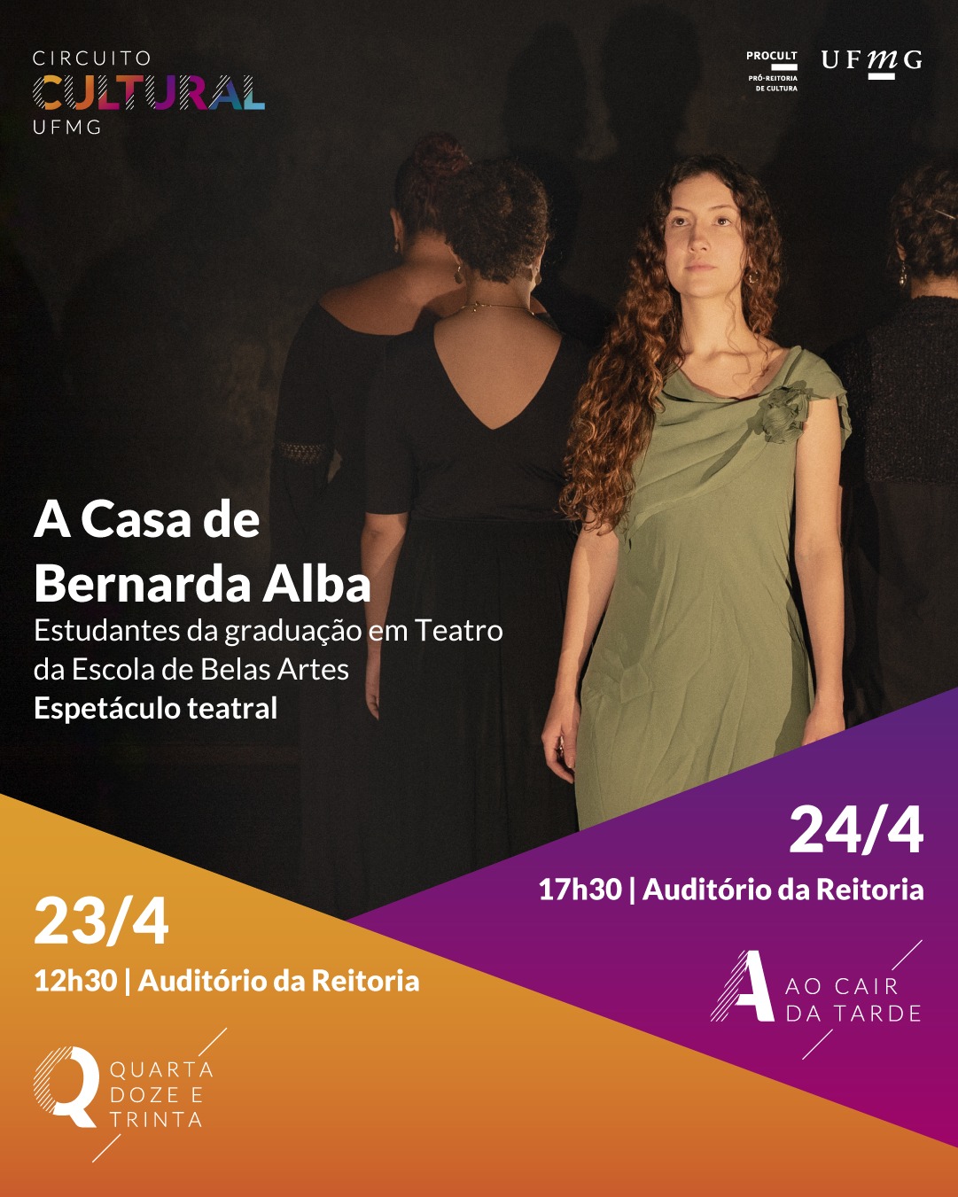 O espetáculo A Casa de Bernarda Alba , do poeta e dramaturgo espanhol Federico García Lorca, é a atração da próxima semana nos projetos Quarta Doze e Trinta e Ao Cair da Tarde. A peça será apresentada no auditório da Reitoria da UFMG , no Campus Pampulha , nos dias 23 , às 12h30 , e 24 de abril, às 17h30 . As apresentações são gratuitas e fazem parte do Circuito Cultural UFMG, uma realização da Pró-reitoria de Cultura.