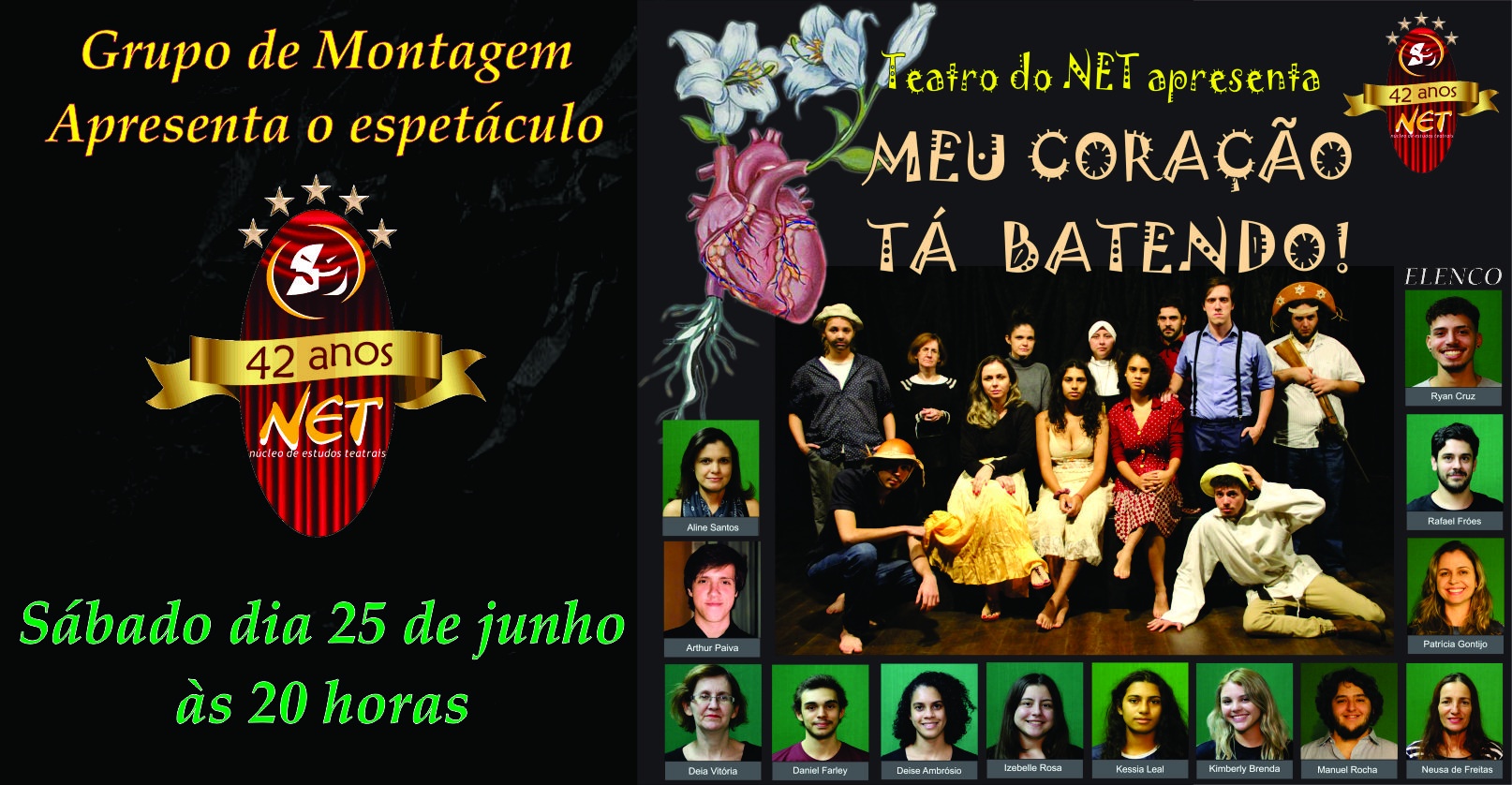 O espetáculo “ MEU CORAÇÃO TÁ BATENDO” traz em cena os alunos do grupo de montagem, que estudam técnicas de preparação para atrizes e atores do Teatro do NET.