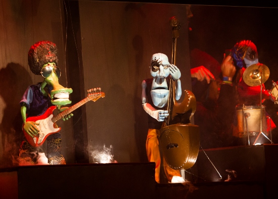 Em cena, atores, uma banda de bonecos, projeções, dança e muita música.
