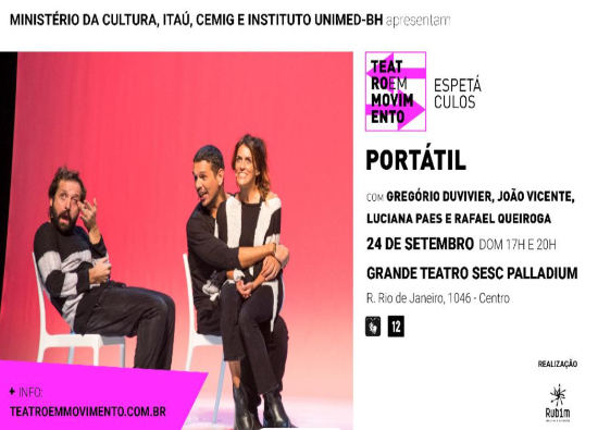 ‘PORTÁTIL’ é um espetáculo de improvisação em formato longo com os atores Gregório Duvivier, João Vicente de Castro, Luciana Paes e o músico Andres Giraldo.