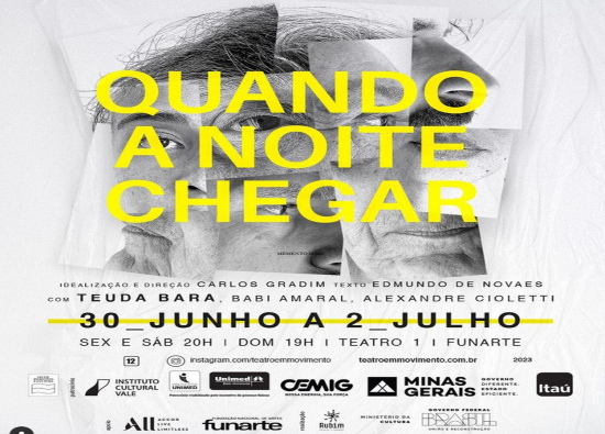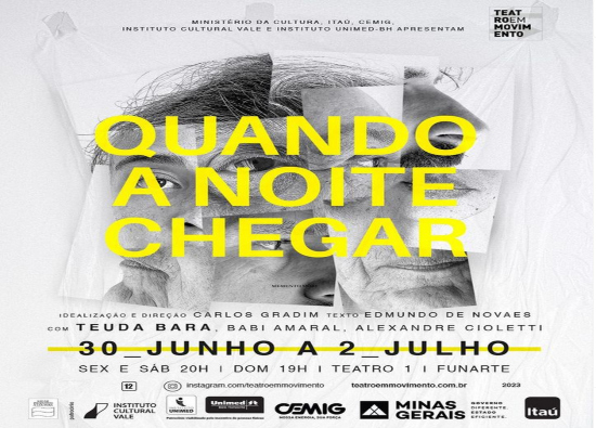 O Festival Teatro em Movimento, que tem curadoria e coordenação geral de Tatyana Rubim, apresenta o espetáculo “Quando a Noite Chegar”, com direção de Carlos Gradim, responsável por encenações como Justa (2017), Horácio (2013) e Amor e Restos Humanos (2001), entre outras; e dramaturgia do ficcionista e professor Edmundo de Novaes Gomes.