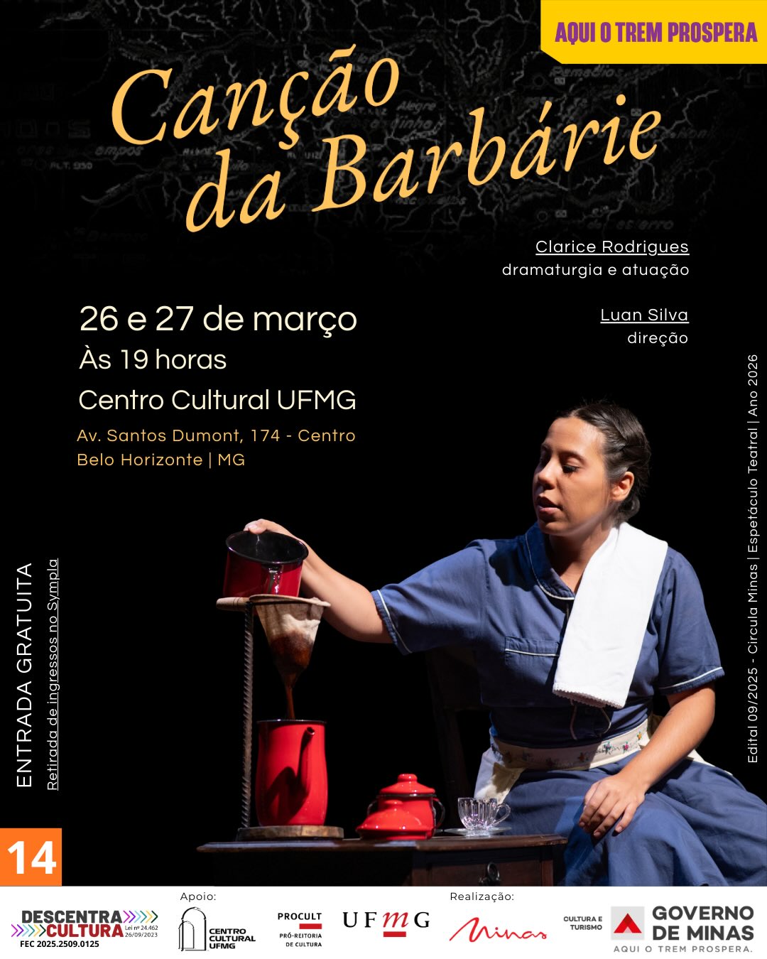 O espetáculo Canção da Barbárie - solo de Clarice Rodrigues com direção de Luan Silva - chega em Belo Horizonte no final de março!
