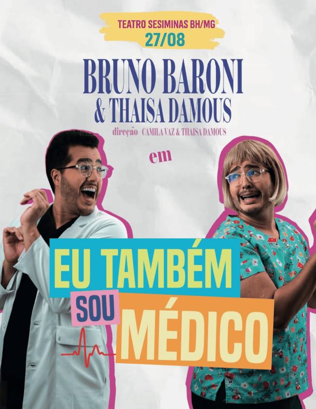 Thaisa Damous interpreta diversos personagens que interagem com o médico Bruno e com a enfermeira Sandra ao longo da peça. No total, o espetáculo apresenta 11 personagens no palco, como a doutora Dinossauro e a doutora Herdeira, que retratam figuras bastante conhecidas por quem já passou por um hospital. “Nossa ideia é realmente fazer uma peça de teatro com momentos e elementos do stand-up”, explica Bruno.