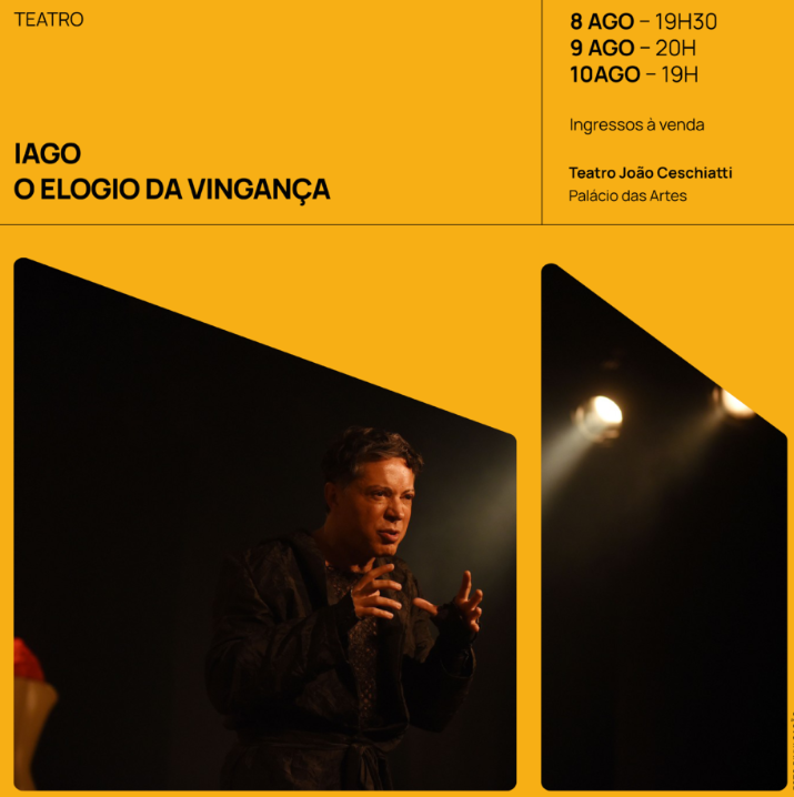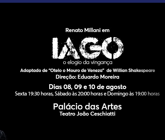 O espetáculo “Iago, o elogio da vingança” é uma adaptação da peça “Otelo, o mouro de Veneza”, de William Shakespeare, feita por Eduardo Moreira (Grupo Galpão), que também assina a direção.
