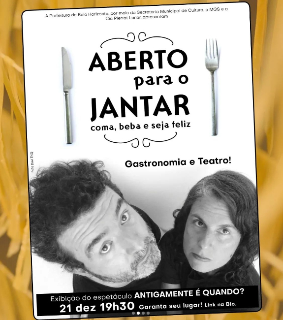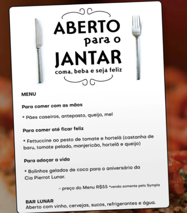 O evento em comemoração do aniversário da Cia Pierrot Lunar, reune Teatro e Gastronomia em um só lugar, ao exibir o espetáculo digital "Antigamente é quando?", e proporcionar um menu com entrada, prato principal e sobremesa (bebidas à parte).