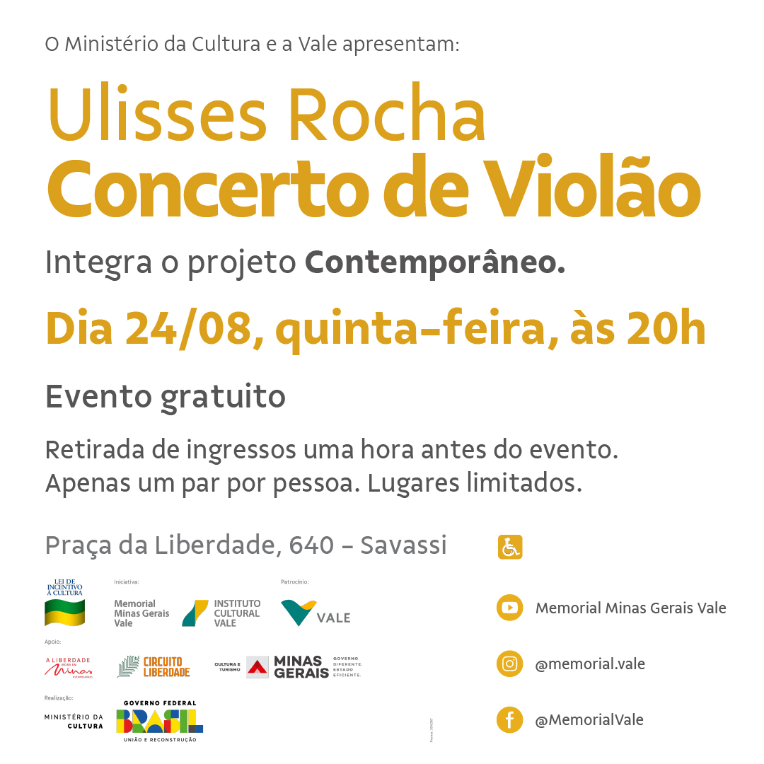 O projeto violão/intercâmbio por meio do Memorial traz a Belo Horizonte o renomado violonista, arranjador e compositor Ulisses Rocha (SP), que celebra o lançamento do seu novo CD “Véu” e a estreia do violão Herrmann 020/2023, construído por Frederico Herrmann e Raul Herrmann Júnior.