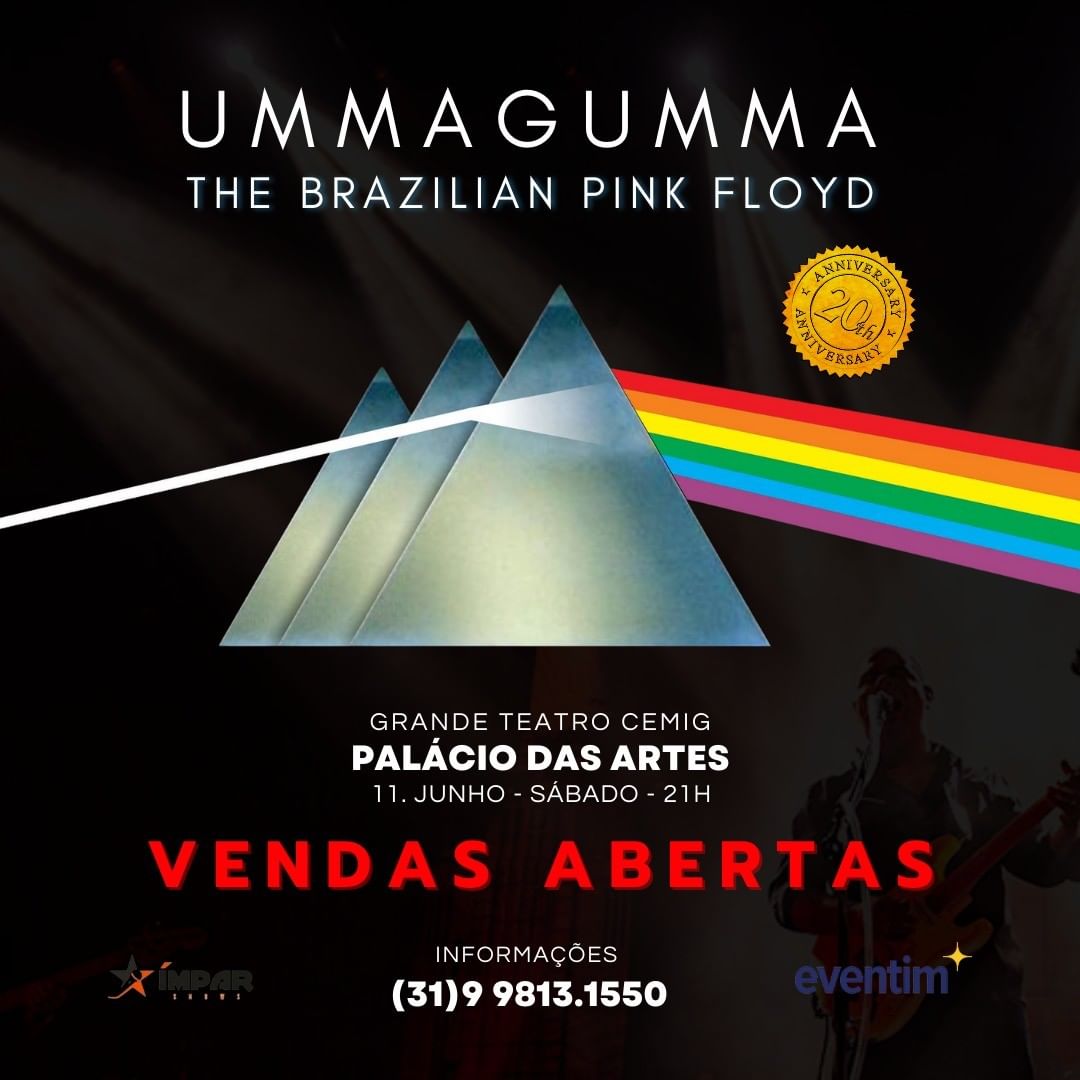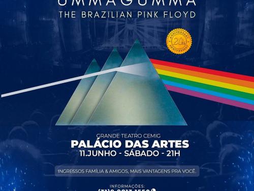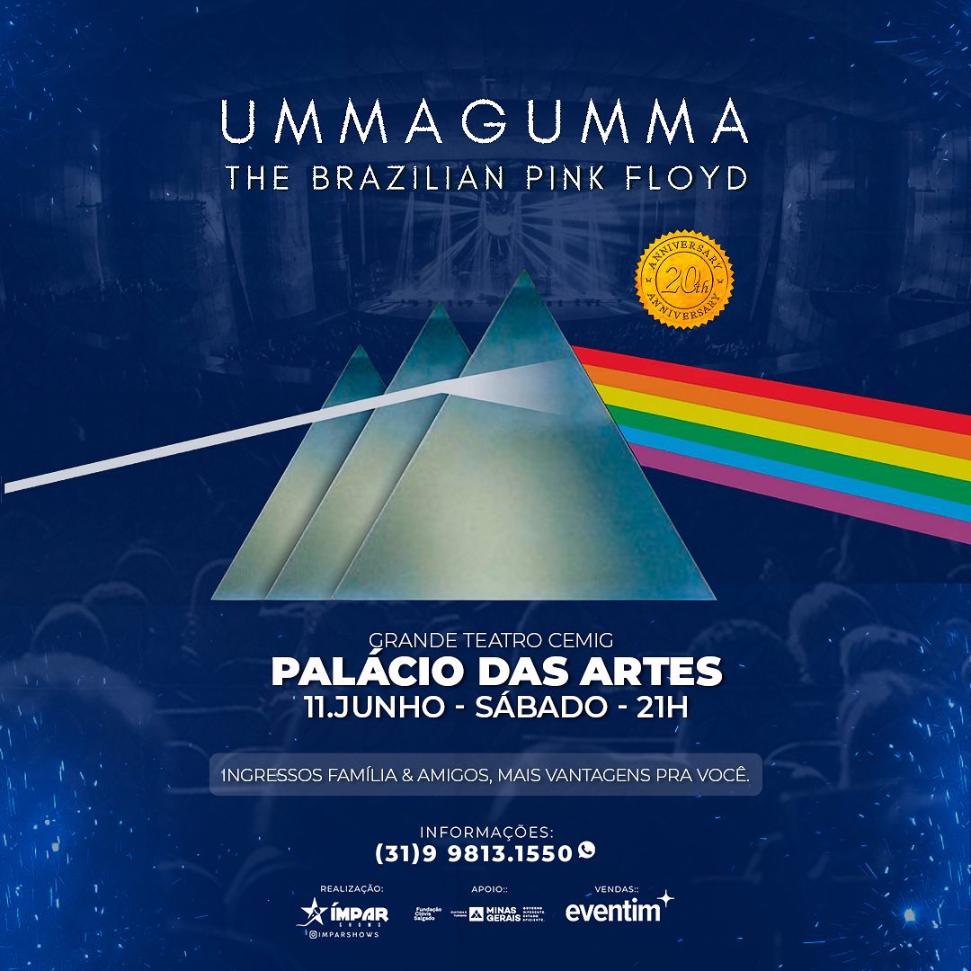 Considerada o maior tributo ao Pink Floyd no país, a Banda Ummaguma The Brazilian Pink Floyd aterrissa no palco do Grande Teatro Cemig Palácio das Artes para apresentar seu show comemorativo de 20 anos de estrada.