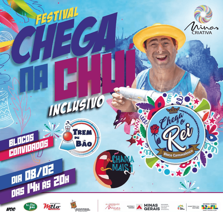 Este evento é inclusivo, celebrando a diversidade e a integração! Os alunos das oficinas de musicalização e percussão, voltadas para o público PCD (Pessoa Com Deficiência), vão se juntar à bateria do Bloco Chega o Rei, mostrando que o lugar de PCD’s é onde eles quiserem estar e brilhar!