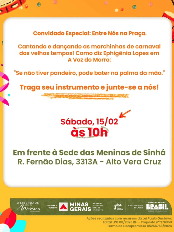 A concentração acontece no sábado, 15 de fevereiro, das 10h às 12h30, em frente à Sede das Meninas de Sinhá, no Alto Vera Cruz.