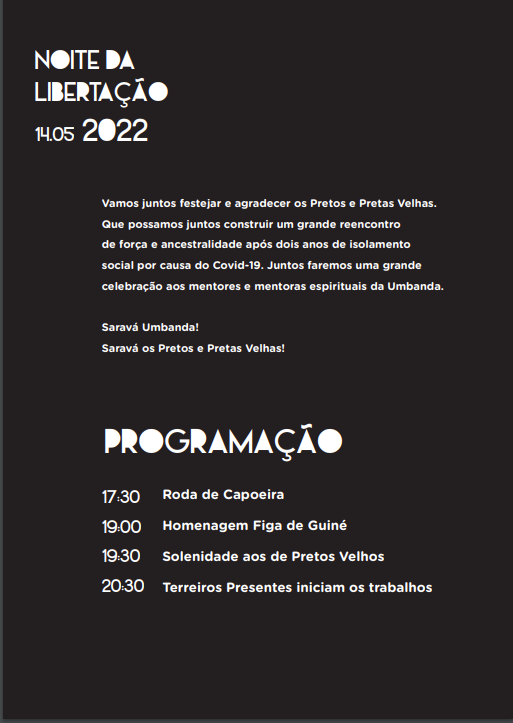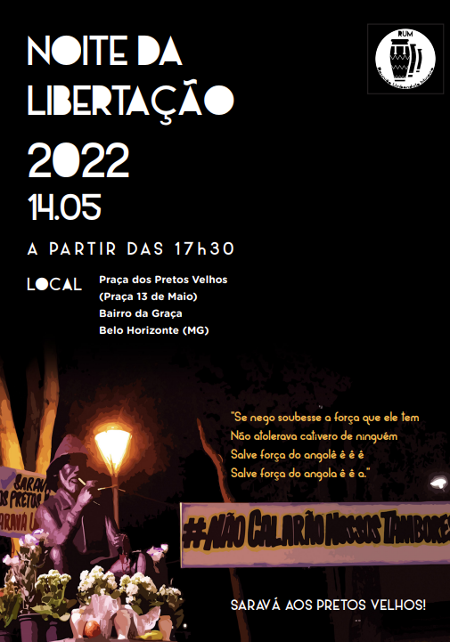 Tradicional festejo denominado “Noite de Libertação” (Festa dos Pretos-Velhos), que acontece há 40 anos na praça 13 de Maio, no bairro da Graça, em Belo Horizonte, está de volta neste final de semana, no dia 14 de maio, a partir das 18 horas, depois de 2 anos de interrupção por causa da pandemia do Covid 19.