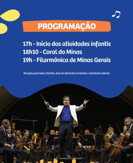O destaque da noite será o concerto especial da Orquestra Filarmônica de Minas Gerais, com participação do Coral do Minas Tênis Clube. Haverá também atividades infantis e uma praça de alimentação com diversas opções.