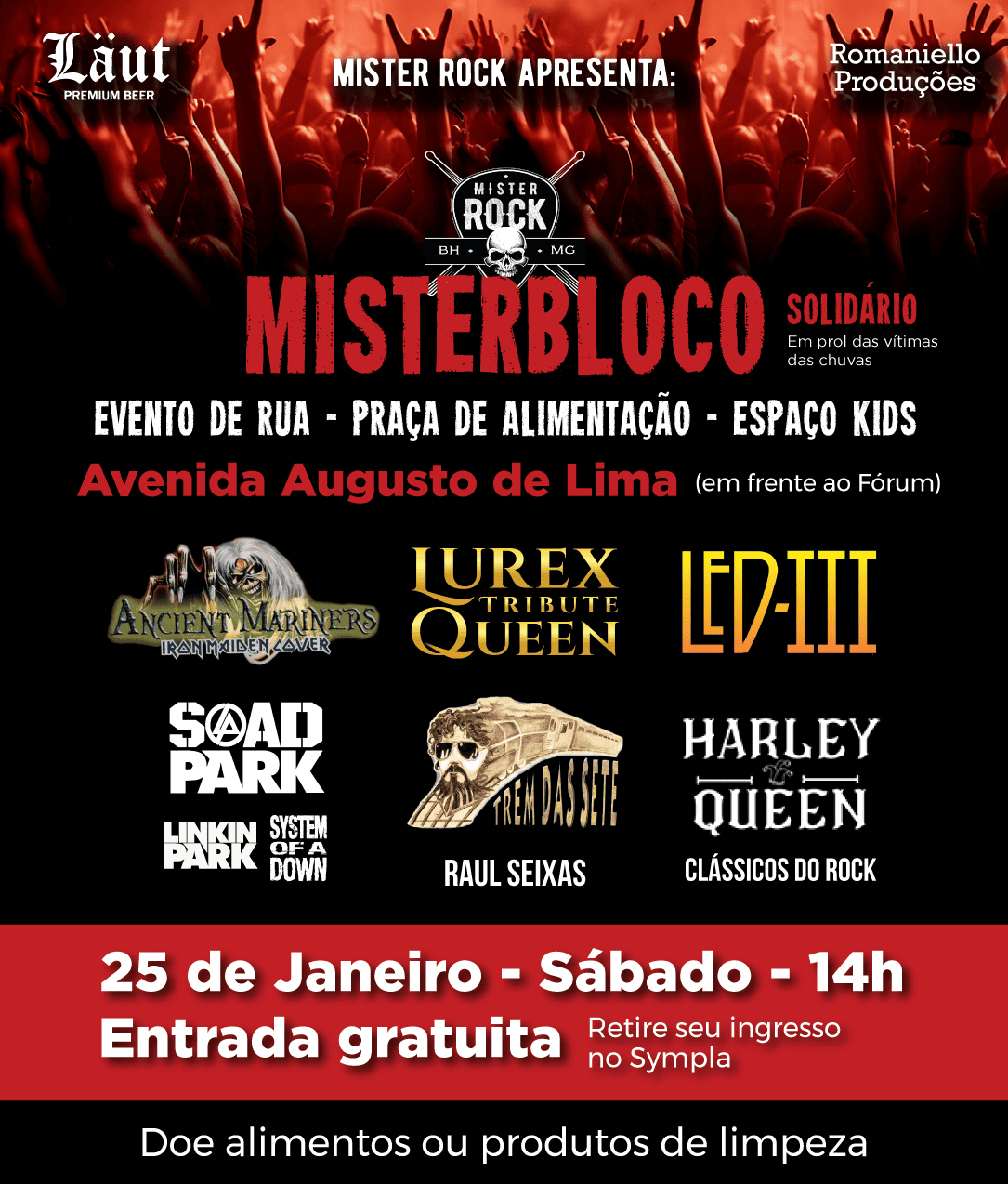 Neste sábado, o Mister Rock coloca o bloco na rua e dá início aos eventos de Pré-Carnaval 100% Rock and Roll! Esta edição será marcada por muita solidariedade, com o público colaborando para ajudar as vítimas das enchentes que atingiram diversas famílias em Belo Horizonte na última quinta-feira, 16 de janeiro.