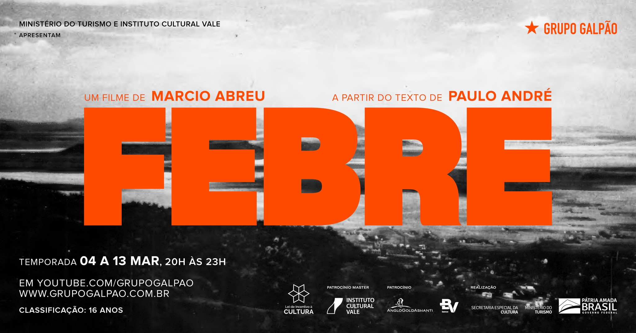 O filme FEBRE, com texto do galpônico Paulo André [@pauloandre] e direção de Marcio Abreu [@marcioabreeu], estreia dia 4 de março, às 20h, no nosso canal no Youtube.
