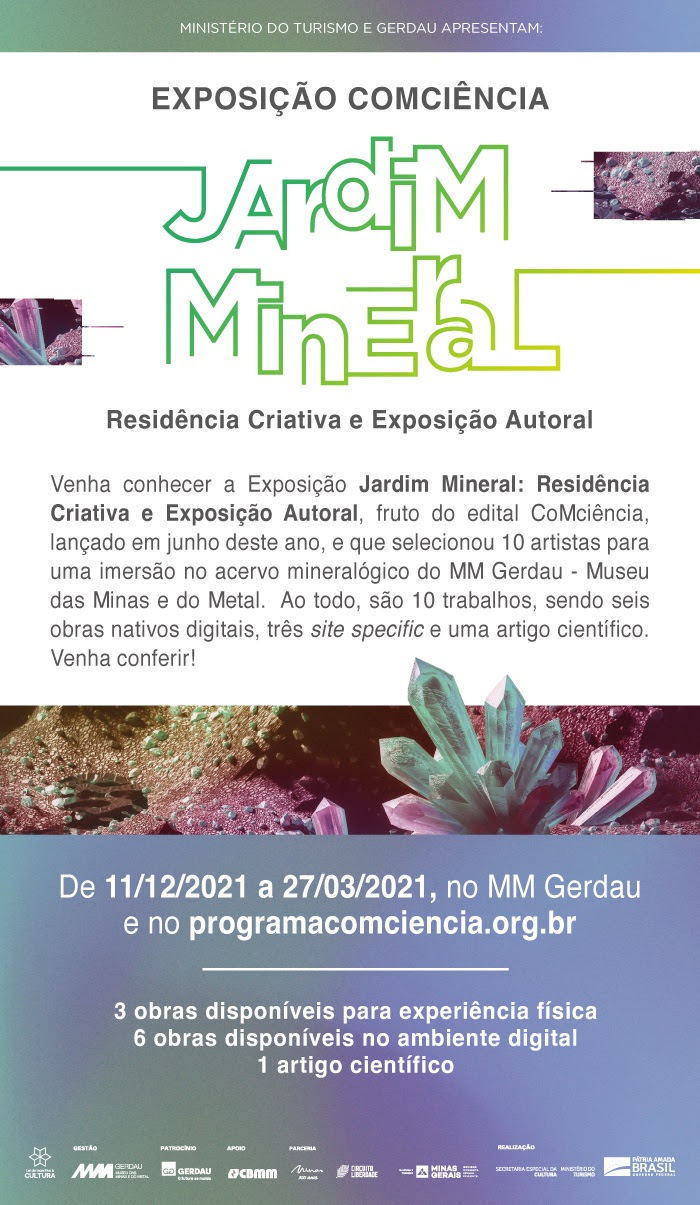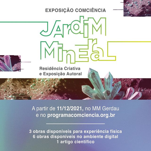 Com o tema “jardim mineral”, o acervo de geociências foi apresentado pelo corpo técnico do museu e as interlocuções em arte, ciência e tecnologia aconteceram entre equipe, artistas e mentores especialistas.