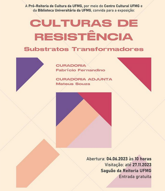 A Pró-Reitoria de Cultura da UFMG, por meio do Centro Cultural UFMG e da Biblioteca Universitária da UFMG, convida para a abertura da exposição ‘Culturas de resistência – Substratos transformadores’, no domingo, dia 4 de junho de 2023, às 10 horas, no Saguão da Reitoria UFMG. A entrada é gratuita e tem a classificação livre.