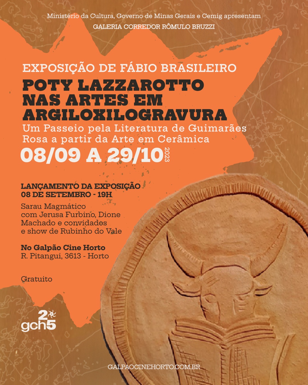 A exposição é uma homenagem ao ilustrador dos livros de Guimarães Rosa, Poty Lazzarotto, que faria 100 anos em março de 2024. As xilogravuras feitas por Poty para o Sagarana foram traduzidas para outro tipo de suporte, o barro, daí o neologismo ‘Argiloxilogravuras’. Objetiva-se criar uma aproximação pelo tato com o público dos deficientes visuais; apresentar as relações literárias rosianas com as influências africanas, indianas, asiáticas e orientais presentes nos livros, bem como as interações entre o barroco mineiro-rosiano com as tradições espanholas do barroco e cubismo, em termos de geometria sagrada.