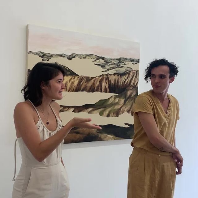 Em suas pinturas, paisagens montanhosas são desconstruídas a partir de recortes feitos com máscaras que deixam aparente a base de preparo do suporte.