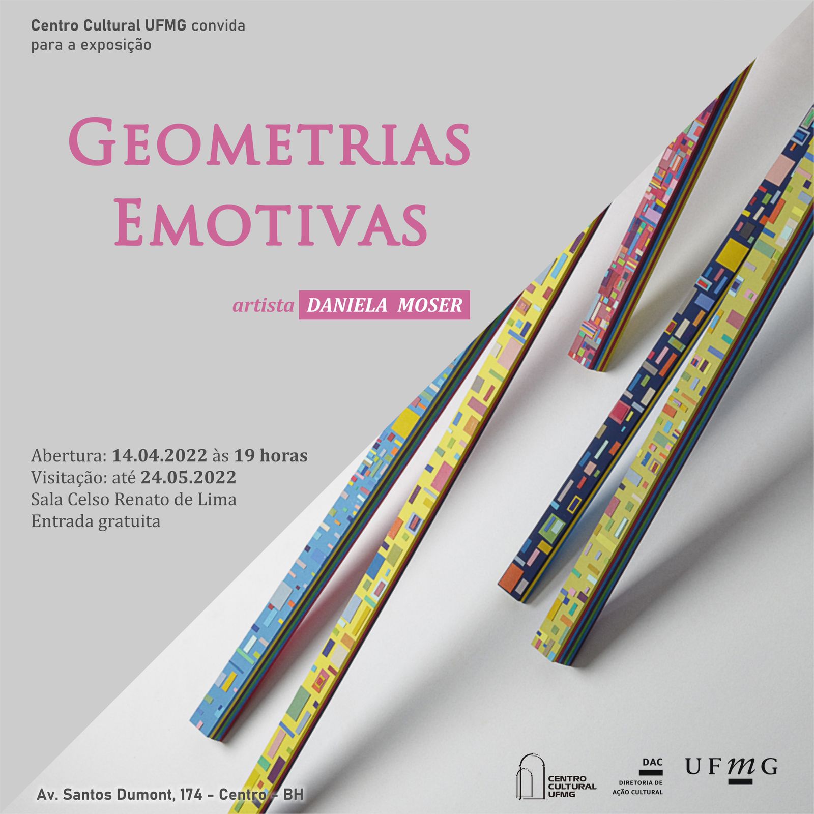 O Centro Cultural UFMG convida para a abertura da exposição “Geometrias Emotivas”, da artista Daniela Moser, na quinta-feira, dia 14 de abril de 2022, às 19 horas.
